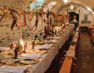 Tidsenlig dukning och rekvisita i festlokal, sånghäften Långbord med bufféer i tre steg, 50 cl öl från 1295 kr ex moms/person (minimum 20 personer) www.sundbyholms-slott.se/vikingamiddag/