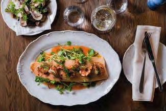 Som varmrätt, missa inte Fisk-& skaldjursgratäng med kammussla, skummig hummersås, krispiga svartrötter & duchessepotatis eller Grillad entrecôte med picklade-& bakade tomater, bearnaisesås, & pommes frites.