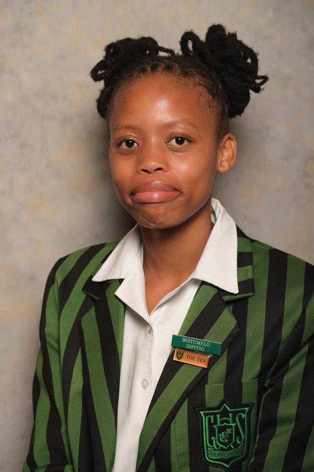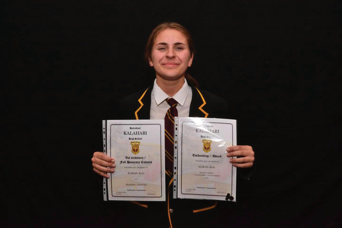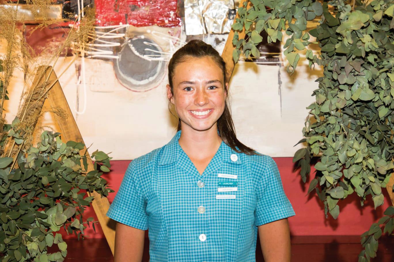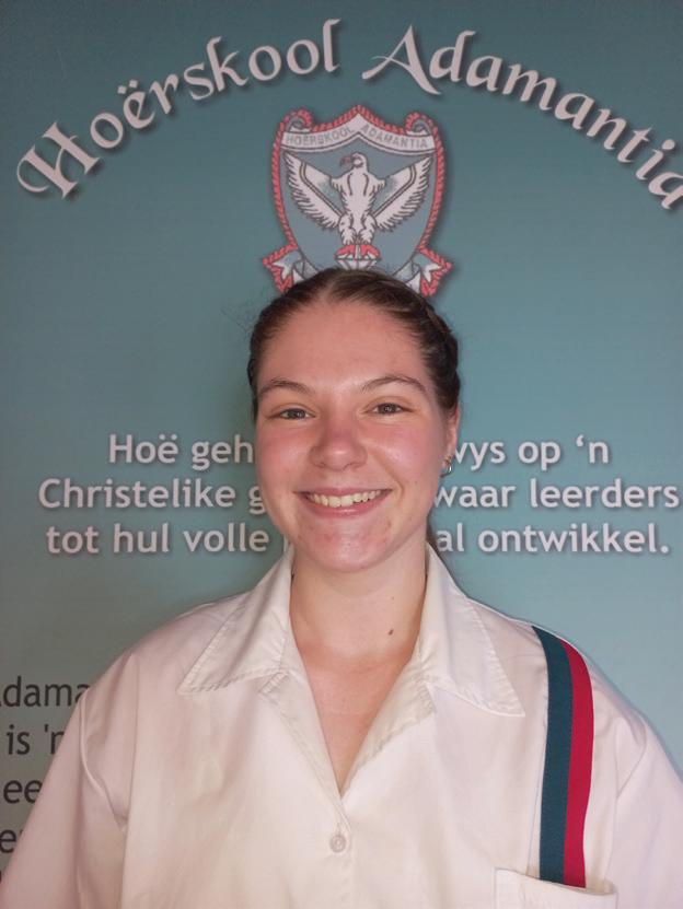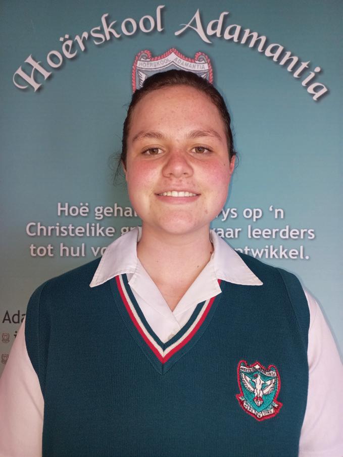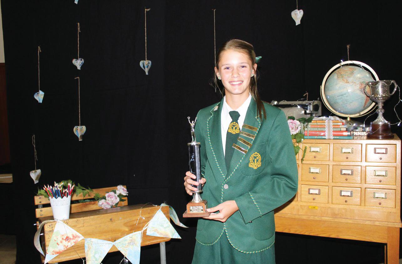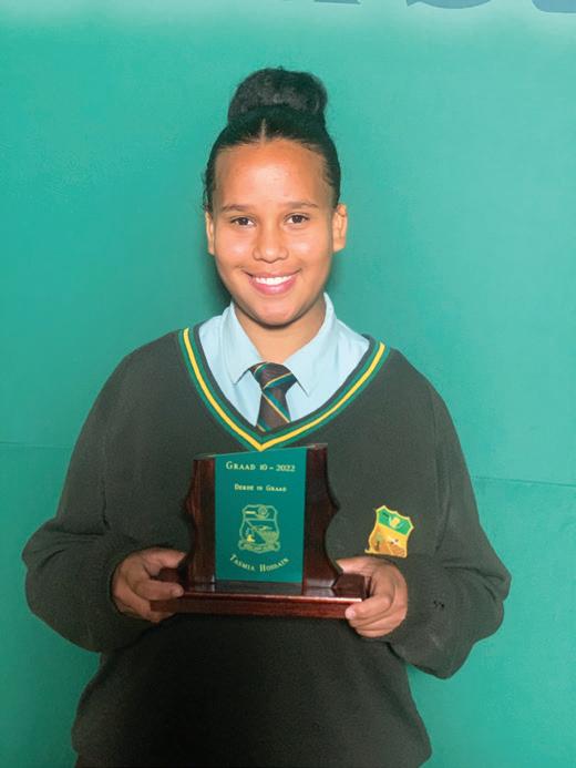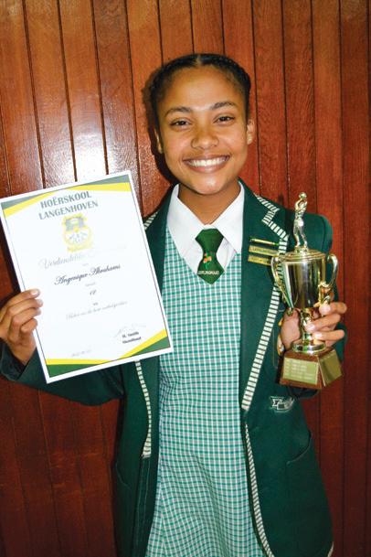 Scorgie Cup - Highest Aggregate in the school and Top learner in Grade 11. Computer Applications Technology, English Home Language, Life Orientation, Life Sciences, Mathematics, Physical Sciences. Boitumelo Dipitso Top learner in Grade 10. Computer Applications Technology, Life Sciences, Mathematics, Physical Sciences. Unathi Leeuw Top learner in Grade 9. Creative Arts – Art, Economic & Management Sciences, Natural Sciences, Technology Chaylin Myburgh Top learner in Grade 8. Creative Arts – Art, Afrikaans First Additional Language, Social SciencesGeography, Mathematics, Technology, Life Orientation. Melissa van Rhyn Achievement Award for Selection and Achievement in the President’s Tug of War team.
