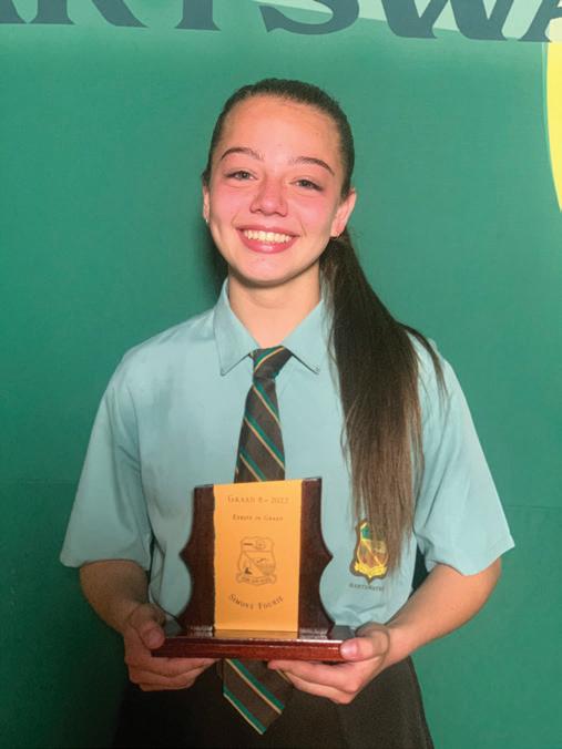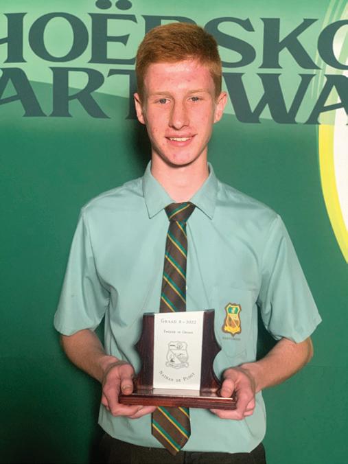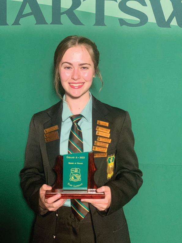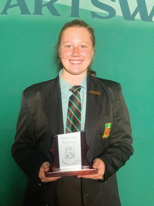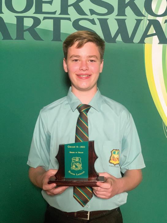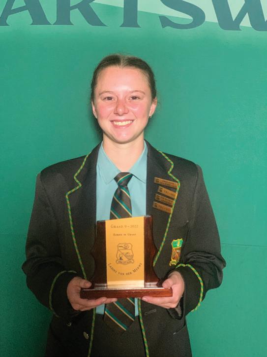 LAERSKOOL HARTSWATER Baie geluk aan die volgende leerlinge wat toekennings by hul prysuitdeling ontvang het. Prysuitdeling 2022 Hoofleiers 2023 Blessing Mrobo (Onderhoofdogter), Miné van Schalkwyk (Hoofdogter), Han-Dries Fourie (Hoofseun) Marais Kluge Dux-leerling Iné du Plessis Sportvrou van die jaar LJ Buys Sportman van die jaar Handré vd Merwe Veelsydigste sportman Ashlin Becker Beste prestasie Gr.7 dogter 1. Simoné Fourie Graad 8 2. Anemé le Grange Graad 9 3. Hanno Lategan Graad 8 2. Nathan du Plooy Graad 8 1. Ladine vd Merwe Graad 9 1. Zaakira Sadek Graad 10 3. Tasmia Hossain Graad 10 3. Tamia Kern 2. Lana McKenzie Graad 10 1. Nina Snyman Graad 11 2. Liza Engelbrecht Graad 11 1. Renier Snyman Graad 12 Dux Leerder met 92,72% gemiddeld, Hy ontvang die AJ Bosman trofee EN die Veelsydigheidstrofee 3. Elri Lategan Graad 11 3. Barend Wright Graad 12 Caitlin Nieuwoudt Ontvang die GJ Lubbe trofee José Labuschagne Ontvang die Hartsie persoonlikheidstrofee 2. Cecilia du Plessis Graad 12 Die skool se jaarlikse prestige prysuitdeling het plaasgevind op 13 Oktober 2022. Graag spog die skool met `n paar van die leerders se prestasies: