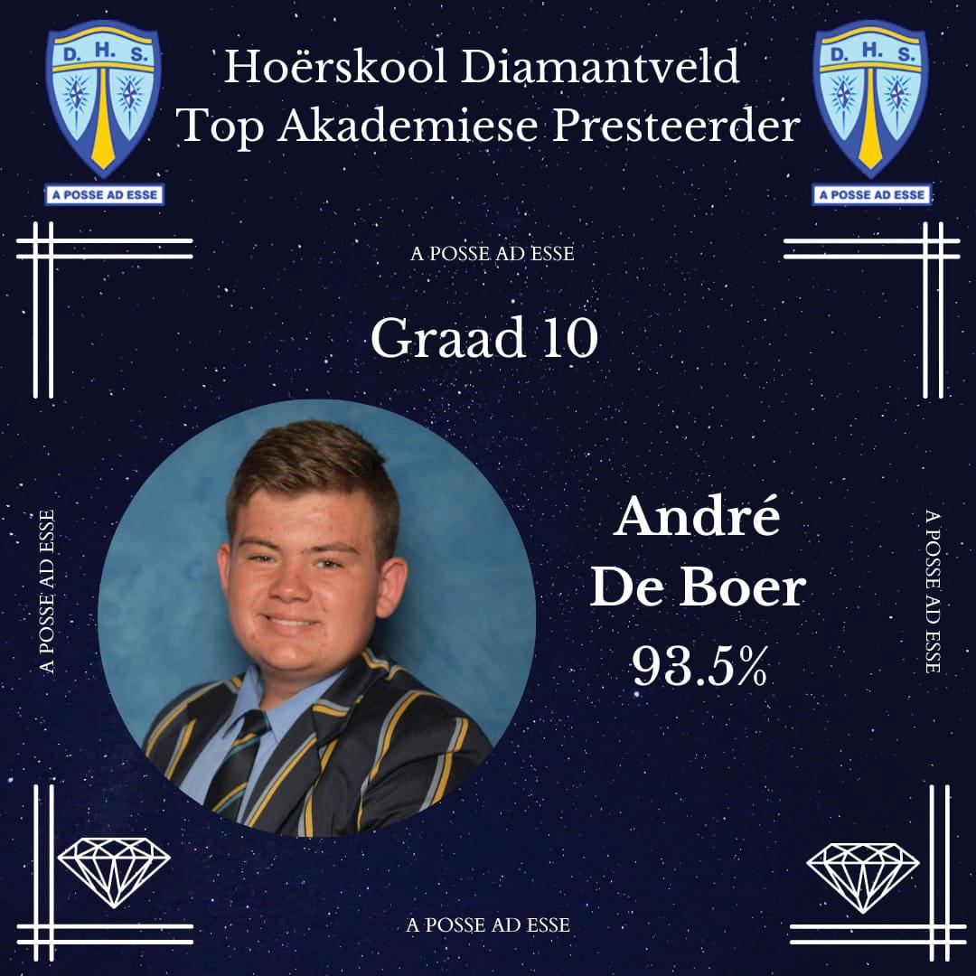 First - Grade 7 Grade 6 - Top 10 4. Jan-Louis de Vries, 8. Megan Bothma, 9. Kayleen Smit, 1. Louise Liebenberg, 10. Alistair Rheeder, 2. Adriaan Naude, 6. Mvelo Msimango, 7. Thato Modise, 5. Heinrich van Aarde and 3. Tayla Shone. Grade 5 - Top 10 10. Ethan Plaatjies, 9. Rabbat Hussain, 2. Carmond Ziegler, 8. Isé de la Querra, 10. Devon