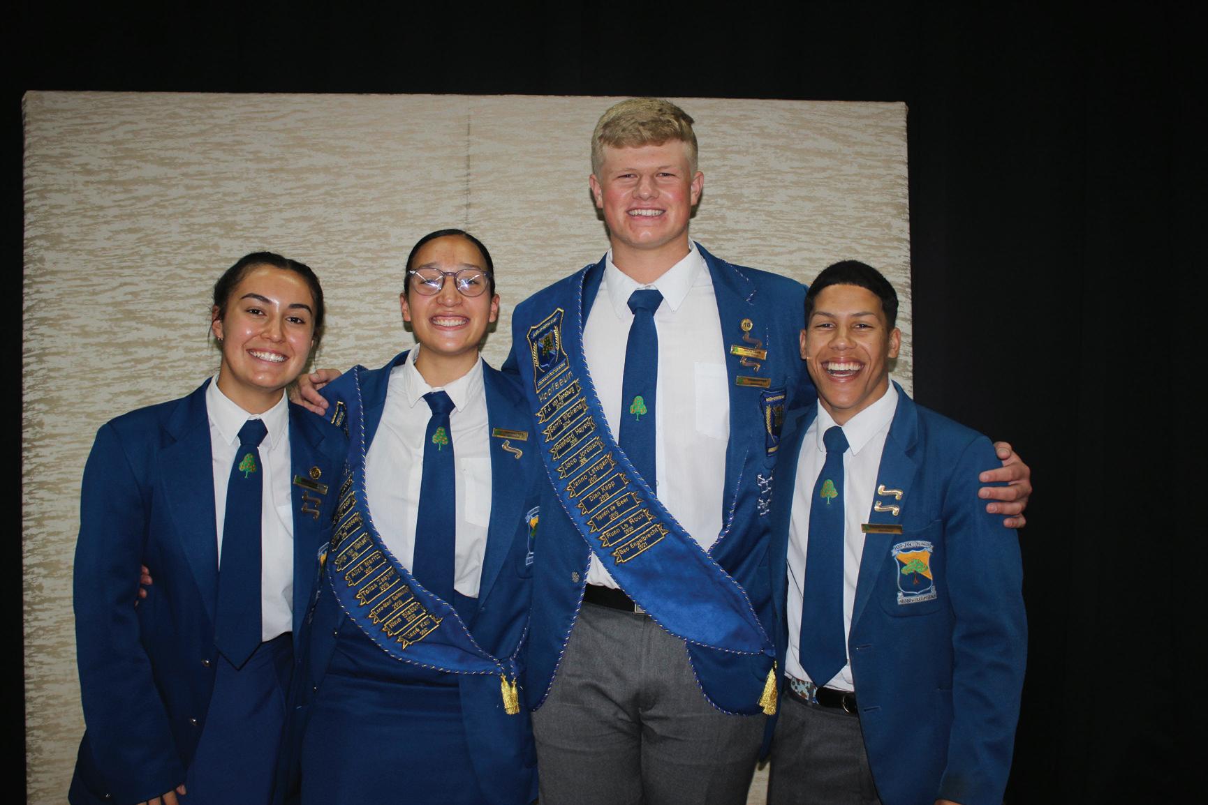 Khanden Naicker (onderhoofseun), Jo-Anneke Krügel (hoofmeisie), Juandré Steenkamp (hoofseun) en Anke Taljaard (onderhoofmeisie)