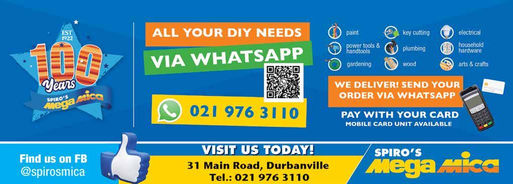 VISIT OUR SHOWROOM TODAY! SCAN ME 1 9 S a l t R i v e r R o a d , S a l t R i v e r , C a p e T o w n W e s t e r n C a p e S o u t h A f r i c a T e l : + 2 7 2 1 4 4 8 6 0 1 2 E m a i l : i n f o @ c a p e u m b r e l l a s c o m W e b s i t e : w w w . c a p e u m b r e l l a s . c o m Let your family enjoy the beauty of the outdoors under the safety of our UV resistant umbrellas! JLT AUTO Quality Assured 8 CECIL MORGAN WAY, UNIT 2, STIKLAND INDUSTRIAL 079 613 0918 | jody.temmers325@gmail.com Vision Works Cape Gate Shopping Centre | Tel: 021 981 9914/9131 Willowbridge 021 180 3219 | willowbridge@hussargrill.com Durbanville 087 809 3885 | durbanville@hussargrill.com