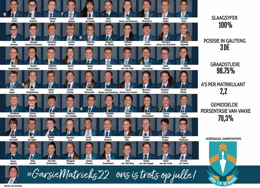Ons is trots op on matriekklas van 2022. Baie geluk aan die volgende leerders: