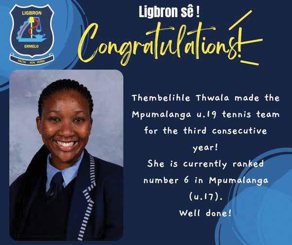 Ons het ‘n kort maar besige tennisseisoen gehad. We had 5 senior teams that played in the league. The first team, boys and girls, and third team, boys and girls ended second in the league and our second team boys ended third . Baie geluk en dankie vir al julle harde werk. Ons het ook met 21 kinders by die o/11 tennis rondomtalie toernooie deelgeneem oor 4 naweke. At the end of it all, our school ended second. Elkeen wat deelgeneem het het ontwikkel met sy spel en het dit baie geniet. Ons sien baie uit na ons volgende seisoen. We also want to congratulate the following players who were chosen for the u/13 Mpumalanga tennis team: Simoné Swart. Evan Jacobs and Joshua Hoffman. Welgedaan / Well done!