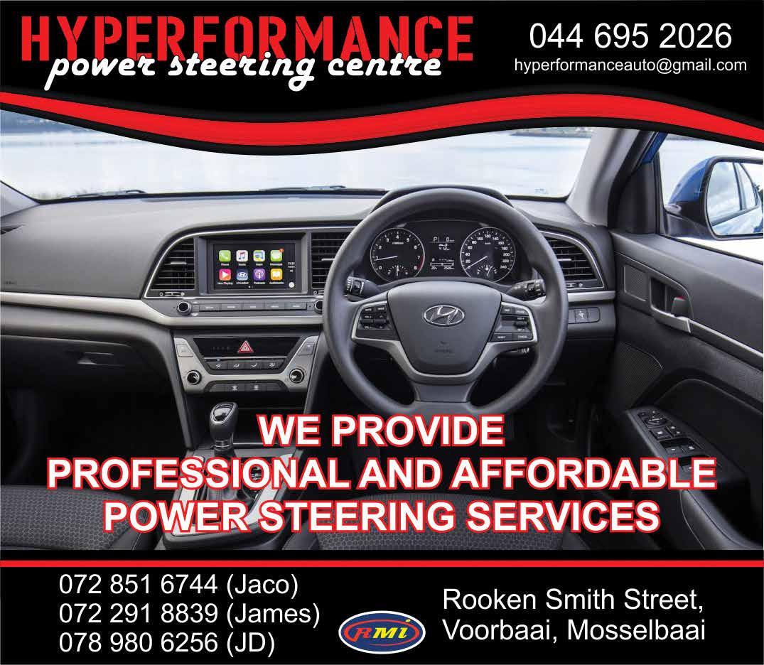 Exhaust | Power Steering | Mag Repair Shocks | Towbar | CV Joints | Services | Welding WE PROVIDE PROFESSIONAL AND AFFORDABLE SERVICES 4 Rooken Smith Street, Die Voorbaai, Mossel Bay 6500 Tel: 044 695 2026 | Email: admin@hyperformance.co.za James 072 291 8839 | Jaco 072 851 6744 | JD 078 980 6256 YOUR 1 STOP AUTO SHOP