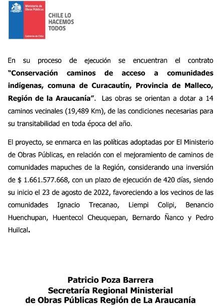 En su proceso de ejecución se encuentran el contrato “Conservación caminos de acceso a comunidades indígenas, comuna de Curacautín, Provincia de Malleco, Región de la Araucanía”. Las obras se orientan a dotar a 14 caminos vecinales (19,489 Km), de las condiciones necesarias para su transitabilidad en toda época del año.