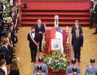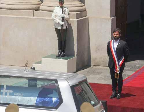 Tras la misa, el féretro se dirigió, de forma lenta hasta la entrada posterior del Palacio de La Moneda. Ahí, lo esperaba el Mandatario Gabriel Boric para darle el último homenaje, y frente a él la guardia de Carabineros.