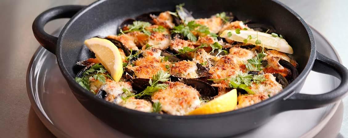 3. Colocar los mejillones en un sartén de hierro y barnizar con mantequilla derretida, agregar el resto del jugo de limón, sal y pimienta.