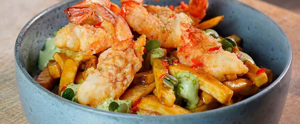5. Colocar en un plato los camarones, las papas y agregar la salsa, terminar con berros.