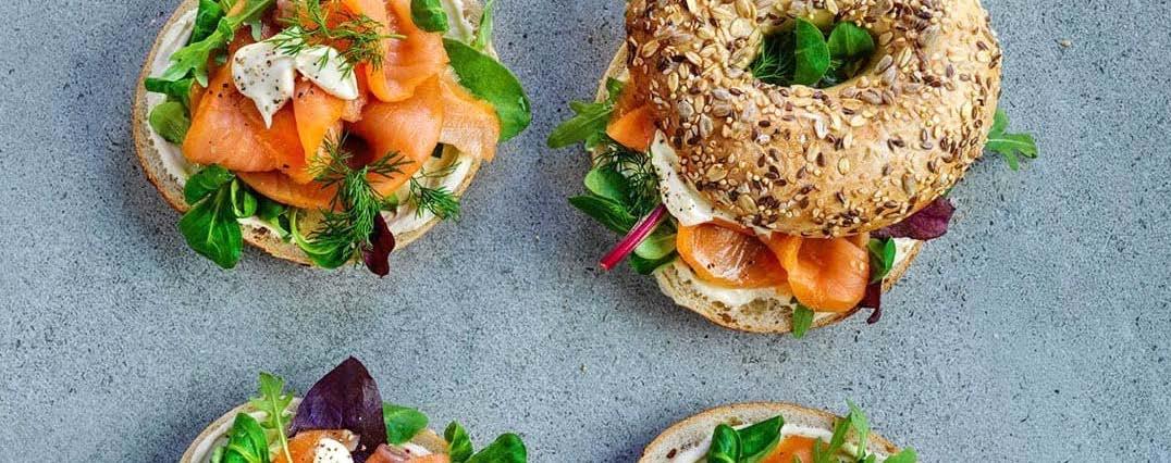 2. Colocar el salmón, tomate rebanado, rodajas de cebolla y aceitunas para formar un emparedado.