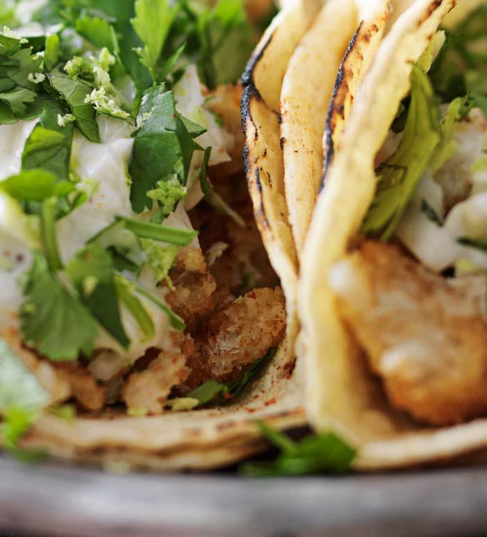 4. Calentar las tortillas y colocar el pescado, agregar la ensalada y terminar con aderezo chipotle.