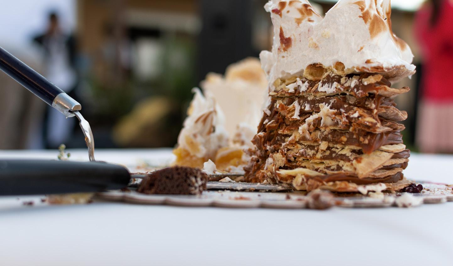 4. Sobre el último disco de masa y utilizando una manga pastelera disponer el merengue suizo y finalizar con bolitas de arroz recubiertas de Chocolate leche.”