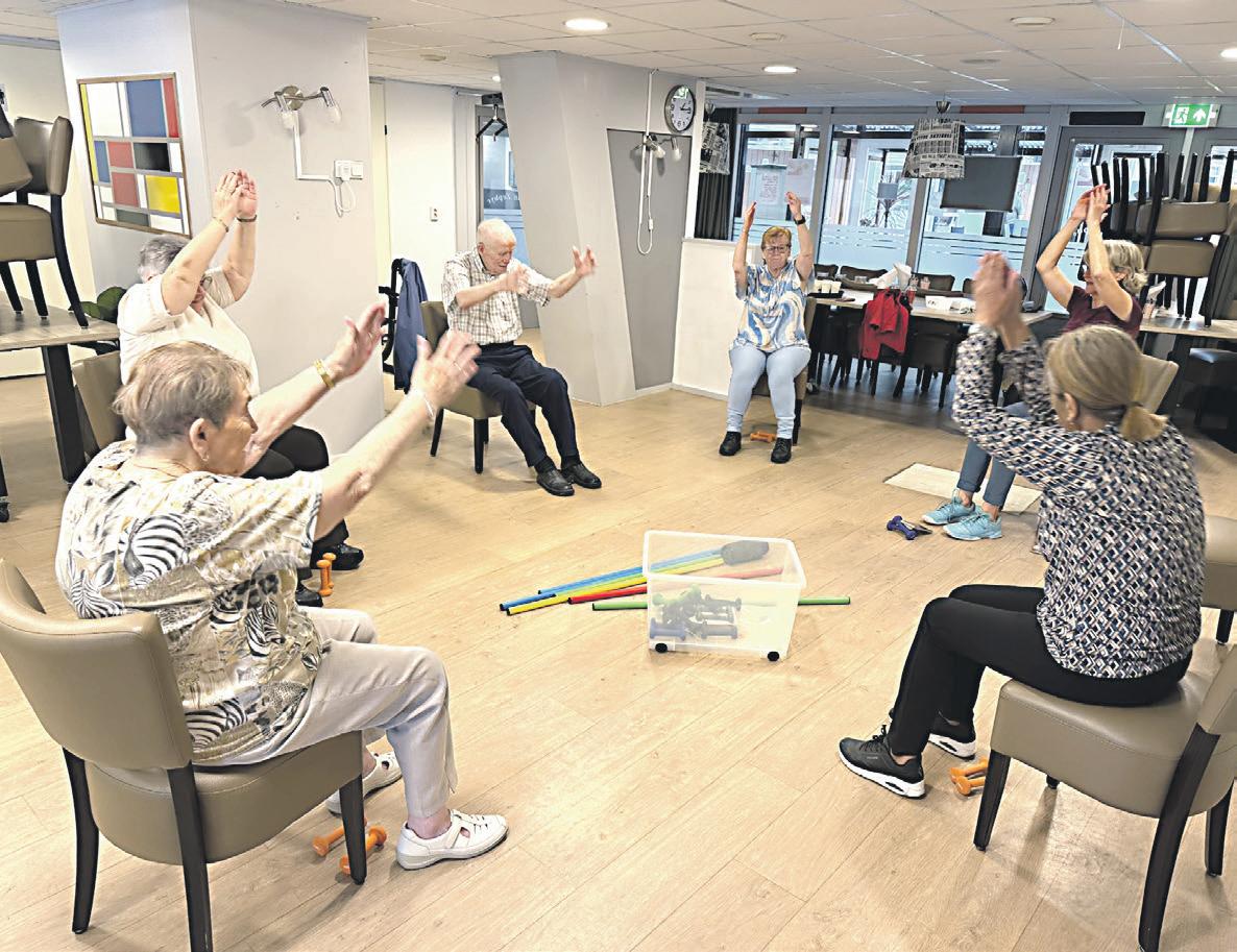 Iedereen is welkom, mensen met een kwetsbare gezondheid maar ook mensen die zich fit voelen en lekker willen sporten. Verschillende mensen zitten en trainen op een stoel. Maar staand bewegen kan natuurlijk ook.