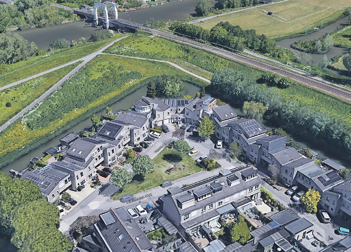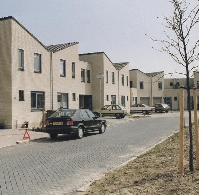 Noordoosthoek van het Rietveld-erf. Van open en bloot naar ingepakt. Vanzelfsprekend het groen, maar ook hier zijn verschillende woningen in hoogte en omvang toegenomen.