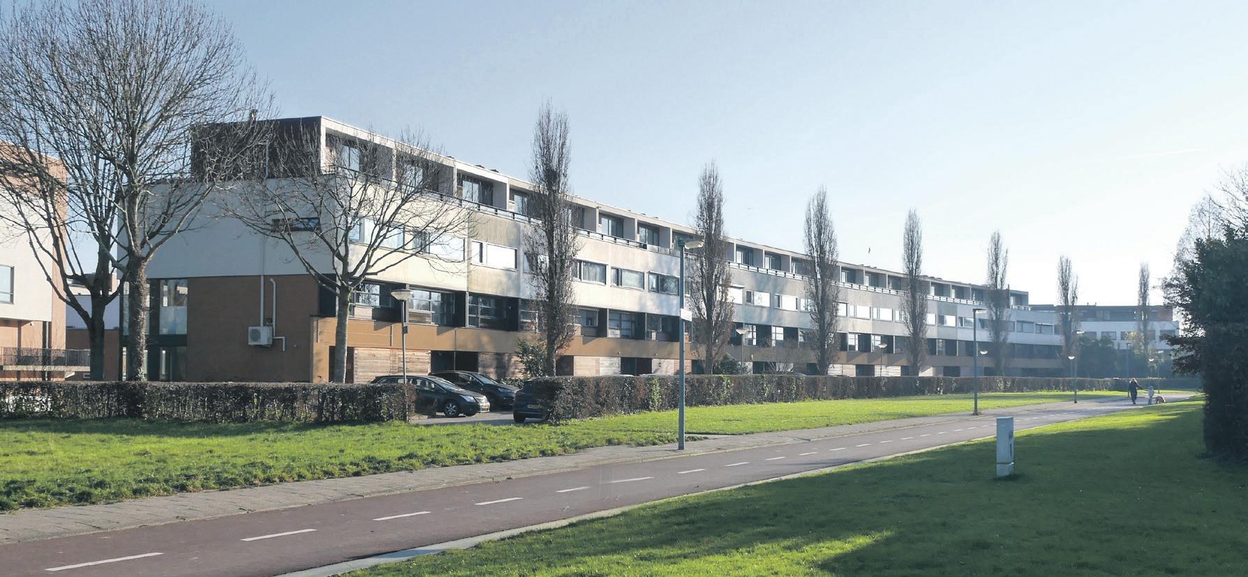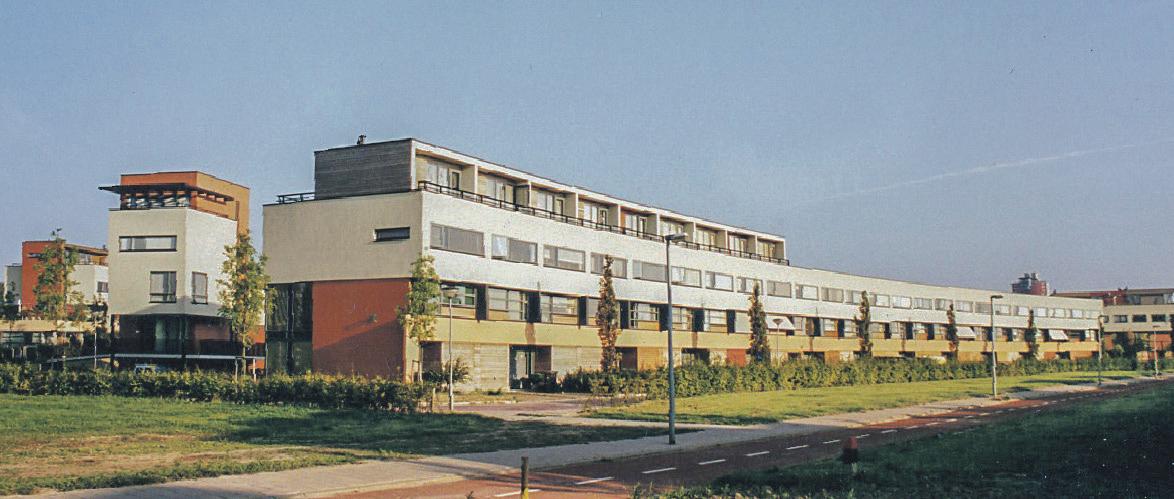 Langs het Flamingopad ligt het afwijkende lange, gebogen blok met 4-laags drive-inwoningen. Daarlangs is ter verlevendiging een aantal opvallende zuileiken geplaatst. In een eerdere Polderkrant meldden we het fors