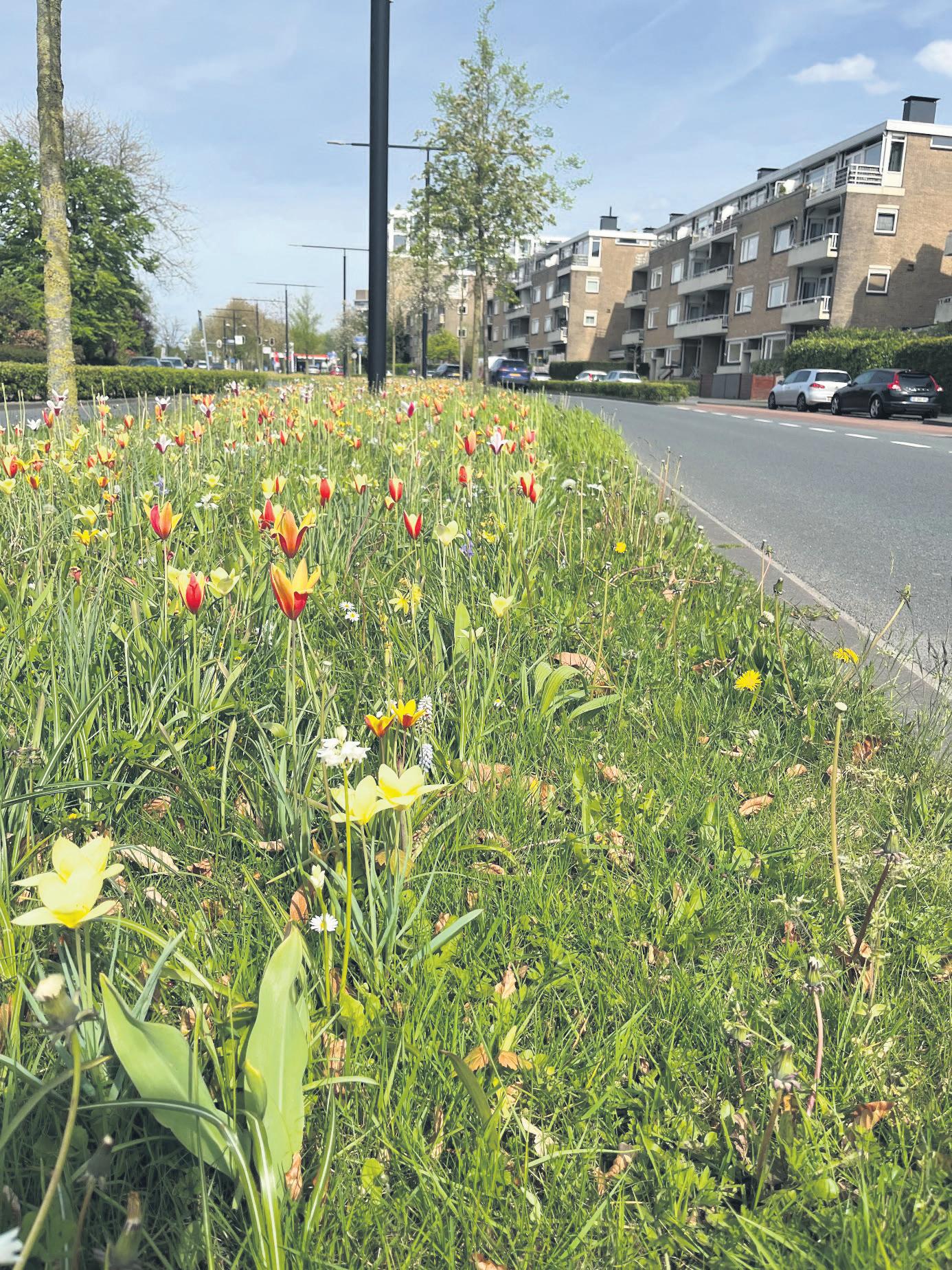 Meters aan bloeiende tulpen in de middenberm van de Oranjelaan