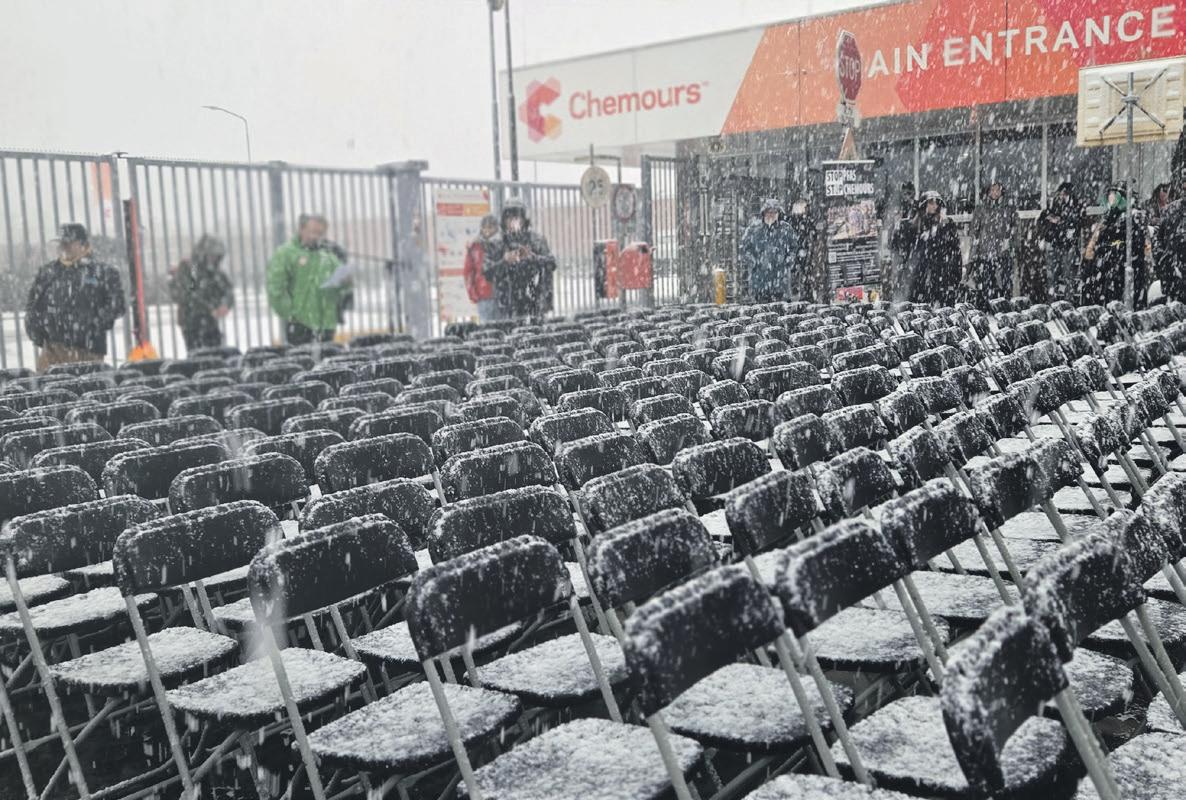 Driehonderd klapstoelen stonden er de eerste zaterdag van 2026 voor de poort van Chemours om het driehonderdste emmertjesprotest te markeren.