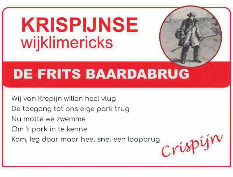 Het initiatief voor ons sympathieke idee komt van een lokale partij, één hunner gemeenteraadsleden had namelijk onze limericks gelezen. U begrijpt: wij zijn diep gevleid met deze aandacht tot in de hoogste regionen van ons stadsbestuur voor de lyrische hoogstandjes van onze onvolprezen wijkpoweet. Maar stiekem hadden we eigenlijk liever een ander bruggetje geslagen. Bewoners uit het overgrote deel van Oud-Krispijn moeten thans nog steeds helemaal via Nieuw-Krispijn of het Van Baerleplantsoen omlopen om het park in te kunnen. Want water verspert de Oud-Krispijnse toegang tot het park en we hadden zo gehoopt dat dit overbrugd zou worden. Beetje jammer wel.