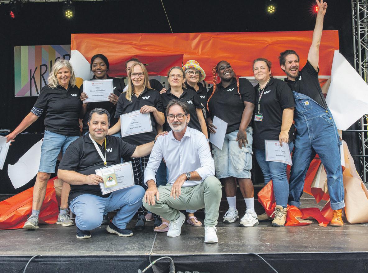 De tien buurtverbinders, in zwart poloshirt, hebben er zin in. Vooraan rechts zit Eric Hendriks, de bedenker van de digitale ontmoetingsplek. Foto: Peter Verheijen