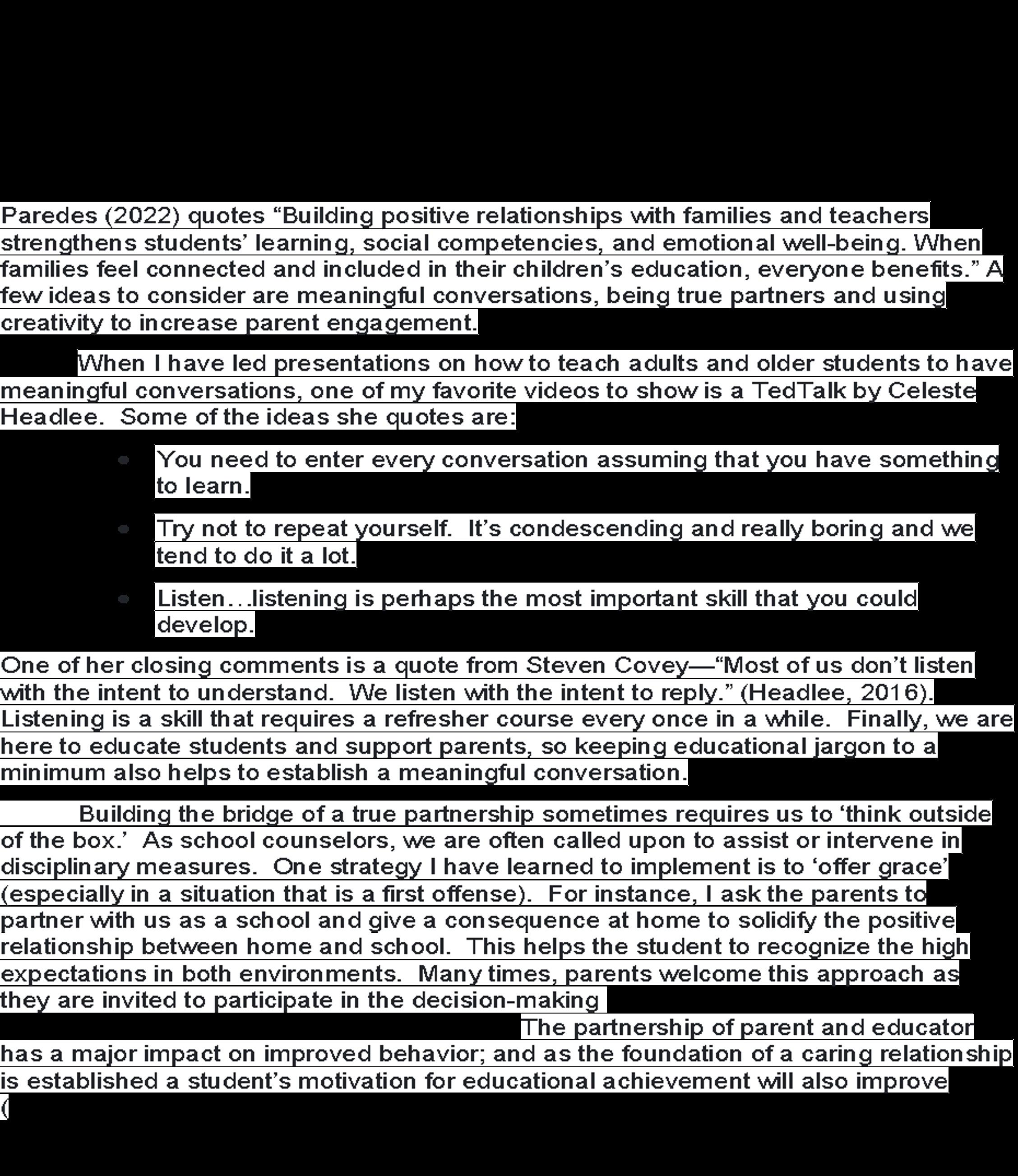 Paredes, M. (2022). 6 Strategies for Effective School Family Engagement Events. Retrieved from https://ies.ed.gov/ncee/rel/Products/Region/northwest/Blog/100806