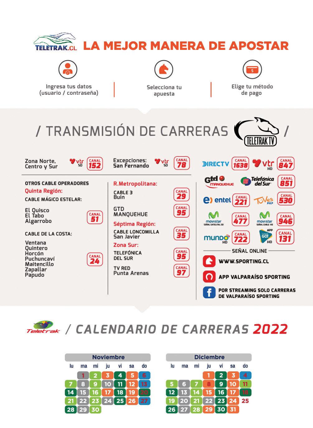 La información, estadísticas, diseño gráfico y sus formas de presentación en las distintas secciones de esta revista, son propiedad exclusiva del Valparaíso Sporting Por tanto, se encuentra prohibida su reproducción, ya sea en forma total o parcial, inclusive, los segmentos de las páginas que componen esta revista. La infracción a esta prohibición, facultará al Valparaíso Sporting a ejercer las acciones legales que correspondan. Debido al alto número de información que contiene cada publicación de nuestra revista, es posible que en ciertos casos pueda presentarse algún error u omisión. Se hace presente que nuestra base de datos está en constante proceso de revisión, p ara de esta forma lograr la información de excelencia que nuestros lectores se merecen. En el caso de suspenderse alguna reunión programada, no se afectuarán devoluciones de revistas vendidas con anterioridad, ni el importe de avisos contratados.