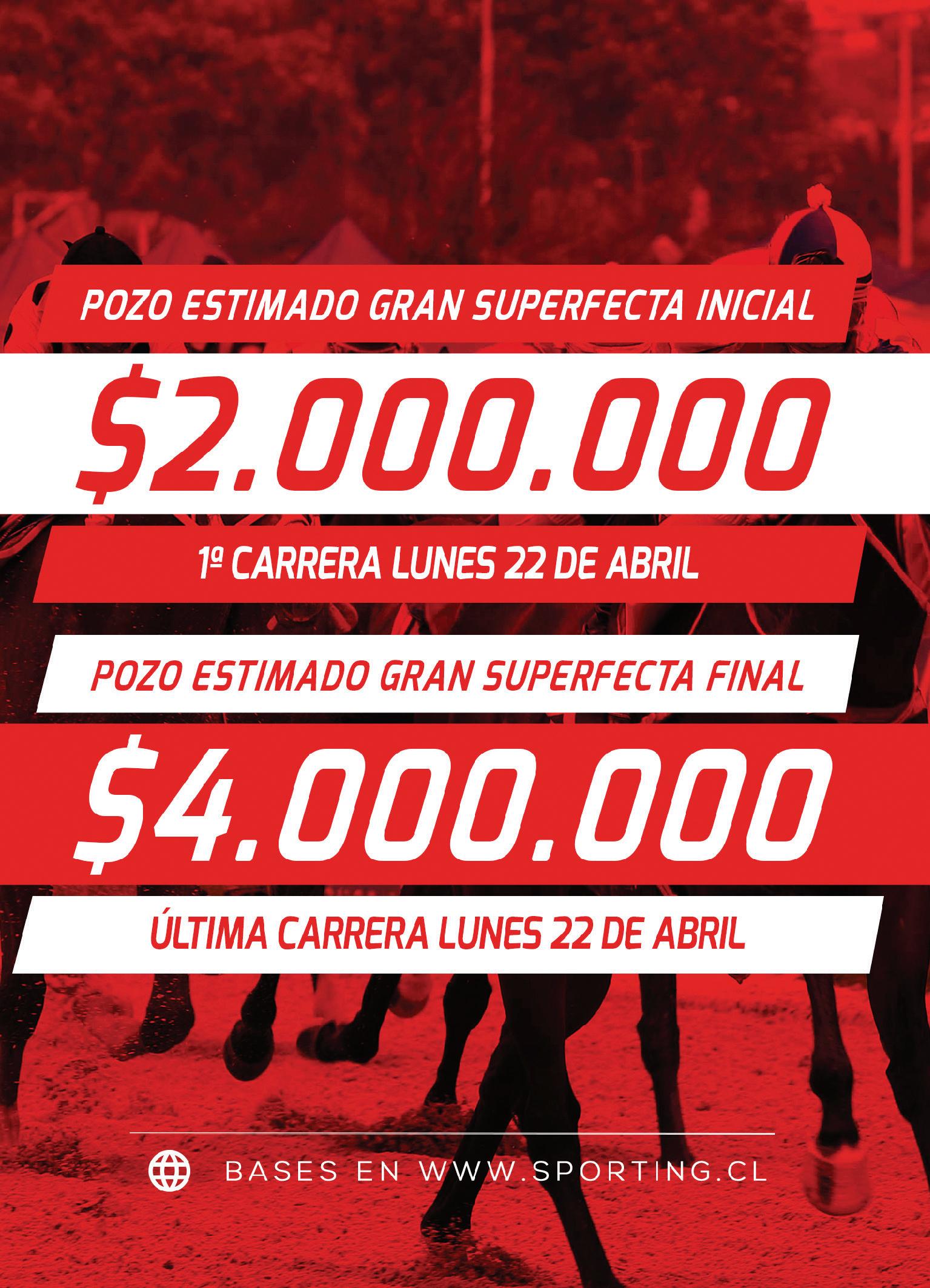 amarillo y celest en casco 03abr244501100Vna1º*1/257Fully Loaded1:08:19(5)56Benjamin Sancho$56-412412 25mar244561100Vna2º158Crisromane1:08:68(4)56Jose Cueto$156-3114110 17mar244411100Vna5º4 1/457Dubai Girl1:08:42(5)57Jose Cueto$595-39768 07mar244501000Hna12º*1656Una Propuesta0:57:54(6)55Jose Cueto$178-58689 6 5 4 3 1 2 Ganador, Segundo, Tercero, Exacta, Quinela, Trifecta, Gran Superfecta Final $ 200 3a ETAPAGRAN TRIPLE DE MIL.- ENGANCHE Valparaíso Sporting 50 Gral.:1º 2º 3º4º nt ccVSC:1º 2º 3º4º nt ccRegular, Barrosa o Pesada:1º 2º 3º4º nt ccS. Ganadas $ 2ª DOBLE DELZAFE 1ER $ 1.400.000 2DO $420.000 3ER $ 210.000 4TO $ 70.000 Premio: HAMA 5ª Serie. Indice 10 - 5. Para todo caballo. Handicap. 10ª 19:20 horas 1521 * PREMIOS POZO ESTIMADO GRAN SUPERFECTAFINAL$ 4.000.000 PISTAARENA