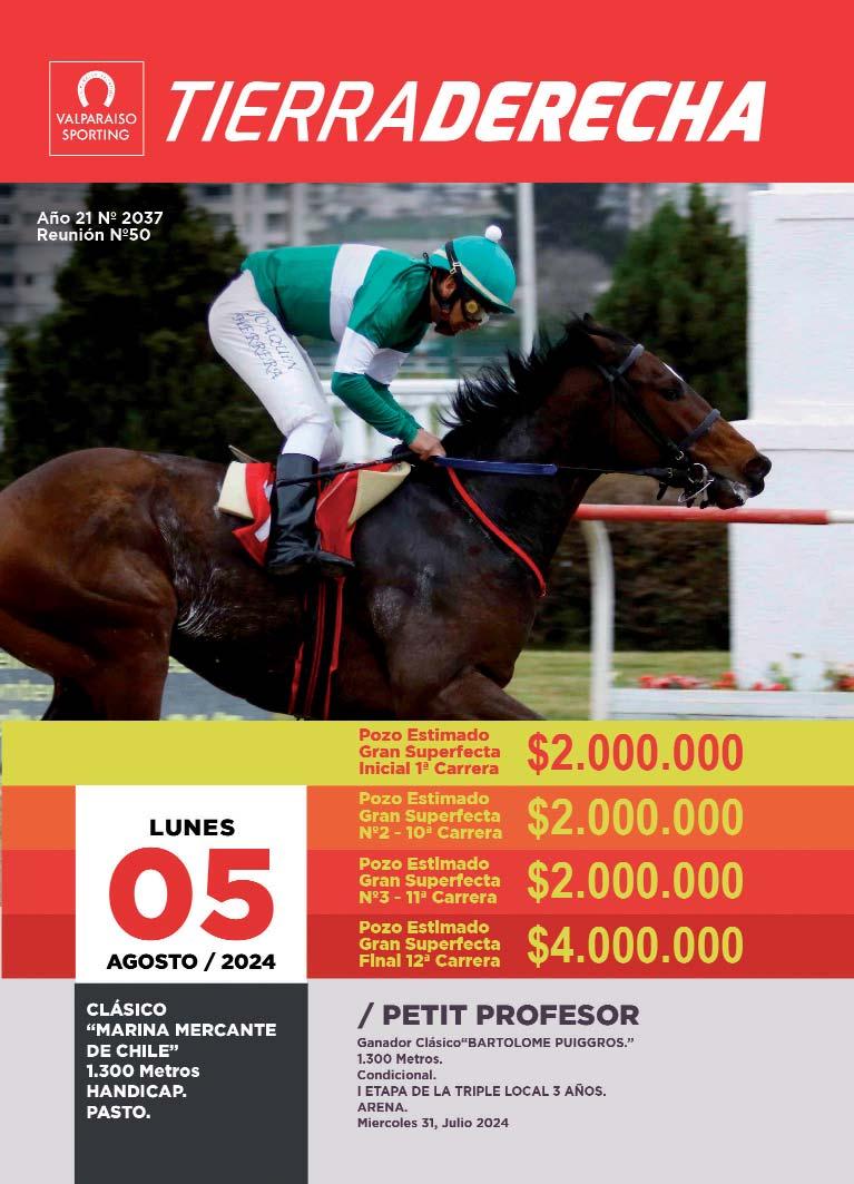 E. Urbina(1)2 m.c Seeking The Dia y Afirmate CatalinaJuan Garciarojo faja en rombos verde Don Salvador por Special Quest (H. Don Alberto)V14mangas y gorra negro 31jul244171100Vna12º10 3/456Varonessa1:08:93(3)56Diego Carvacho $134-229653 24jul244181100Vna2º257Cosas Imposibles1:09:38(2)58Jorge Zuñiga$44-1285712 22jul244181100Vna2ºPcz57,5Soy Nortina1:09:30(1)57Jorge Zuñiga$3 1-128505 10jul244201100Vna6º1056Pato Cuncuna1:08:43(2)55Maximiliano Salinas$64-226728 10abr244181100Vna1º1/257Roy