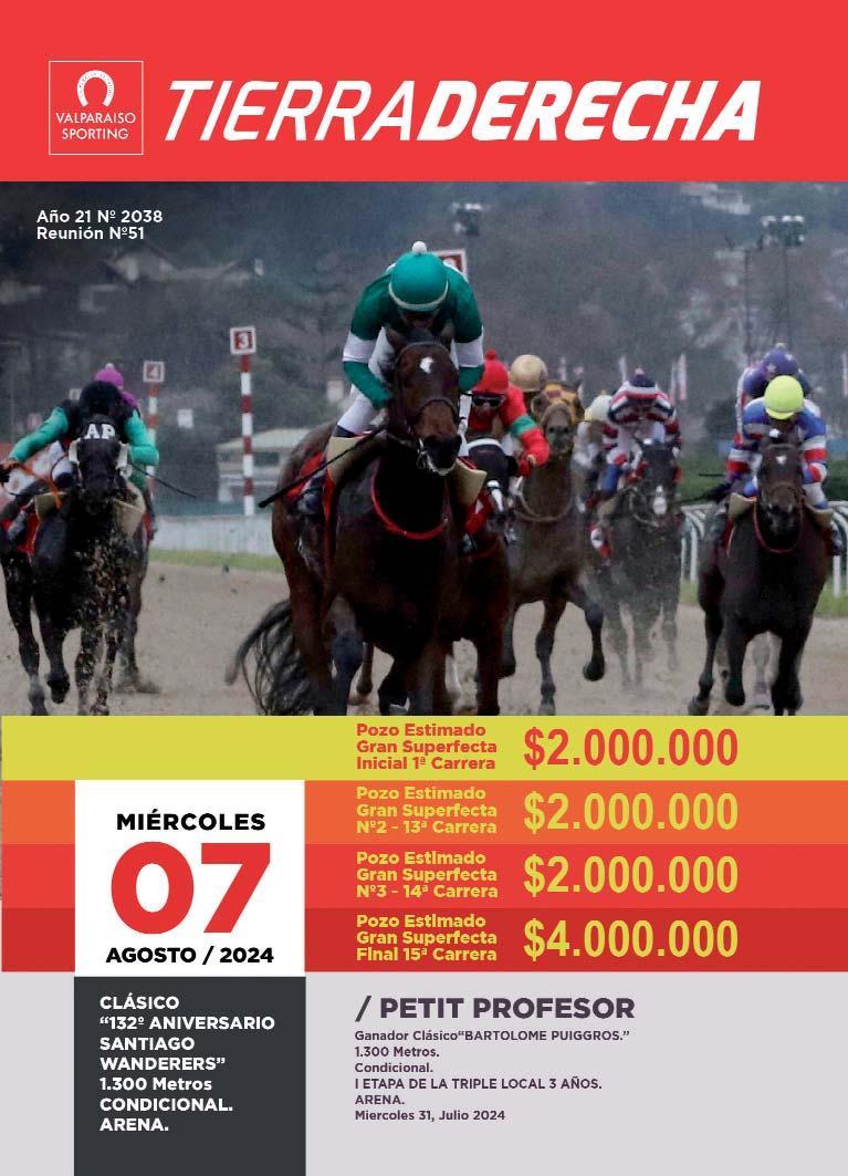 31jul244341000Vnp4º3/458Ejemplo De Valor0:58:14(4)57Israel Villagran$295-229629 17jul244321000Vnp6º1 3/458Puerto Fonck0:58:00(5)56Israel Villagran$237-227511 08jul244301100Vna9º*1054Chalekyta1:09:11(6)55Israel Villagran$109-526535 19jun244251100Vba3º2 3/455,5AQuien Le Importa1:07:56(6)56Sebastian Muñoz$127-423546 27may244241000Vblp1º1 3/457Chalekyta0:59:37(1)57Guillermo A. Perez$31-120202 N 476111947476111947