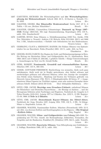 GAETTENS, RICHARD. Die Wirtschaftsgebiete und der Wirtschaftsgebietspfennig der Hohenstaufenzeit. Lübeck 1963. 88 S., 16 Karten u. Textabb. Cl.– St. 6503 Leinen 20.– GALSTER, GEORG. Der Bünstorffer Brakteatenfund. Berlin 1917. 67 S., 8 Tafeln. – SA aus Berliner Münzbläter“. Brosch. 50.– ” GALSTER, GEORG. Unionstidens Udmøntninger. Danmark og Norge 1397– 1540, Sverige 1363–1521. Mit engl. Zusammenfassung. Kopenhagen 1972. 119 S., zahlr. Abb. Standardwerk! Leinen 40.– GARTHE, HUGO. Seine Münzen- u. Medaillensammlung (3580 Nrn. Antike, 5786 Nrn. Mittelalter u. Neuzeit). Auktion J.M. Heberle, Köln 10.9.1884. 328 S. mit 9466 Nrn. 2 Bll., Inhaltsverzeichnis. – Enthält viele Seltenheiten bei den Städtemünzen. Neueres Leinen 60.– GEHRLING, CLAUS u. ERDMANN, RAINER. Die Fuldaer Münzen vom Spätmittelalter bis zur Barockzeit. Fulda (Parzeller) 2001. 181 S., zahlr. Abb. im Text. Glanzkarton 20.– GEIGER, HANS–ULRICH. Der Beginn der Gold- und Dickmünzenprägungn in Bern. Ein Beitrag zur Bernischen Münz- und Geldgeschichte des 15. Jahrhunderts. Bern 1968. 246 S. mit 8 Tafeln (S. 239-246), 1 gefaltete Tabelle. – Einige Unterstreichungen u. Anmerkungen im Text von Dr. Gerald Stefke. Brosch. 30.–