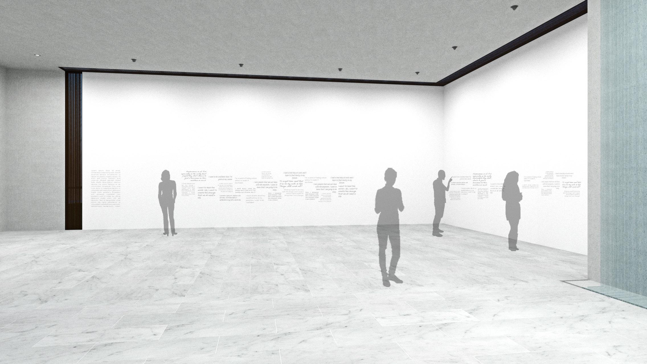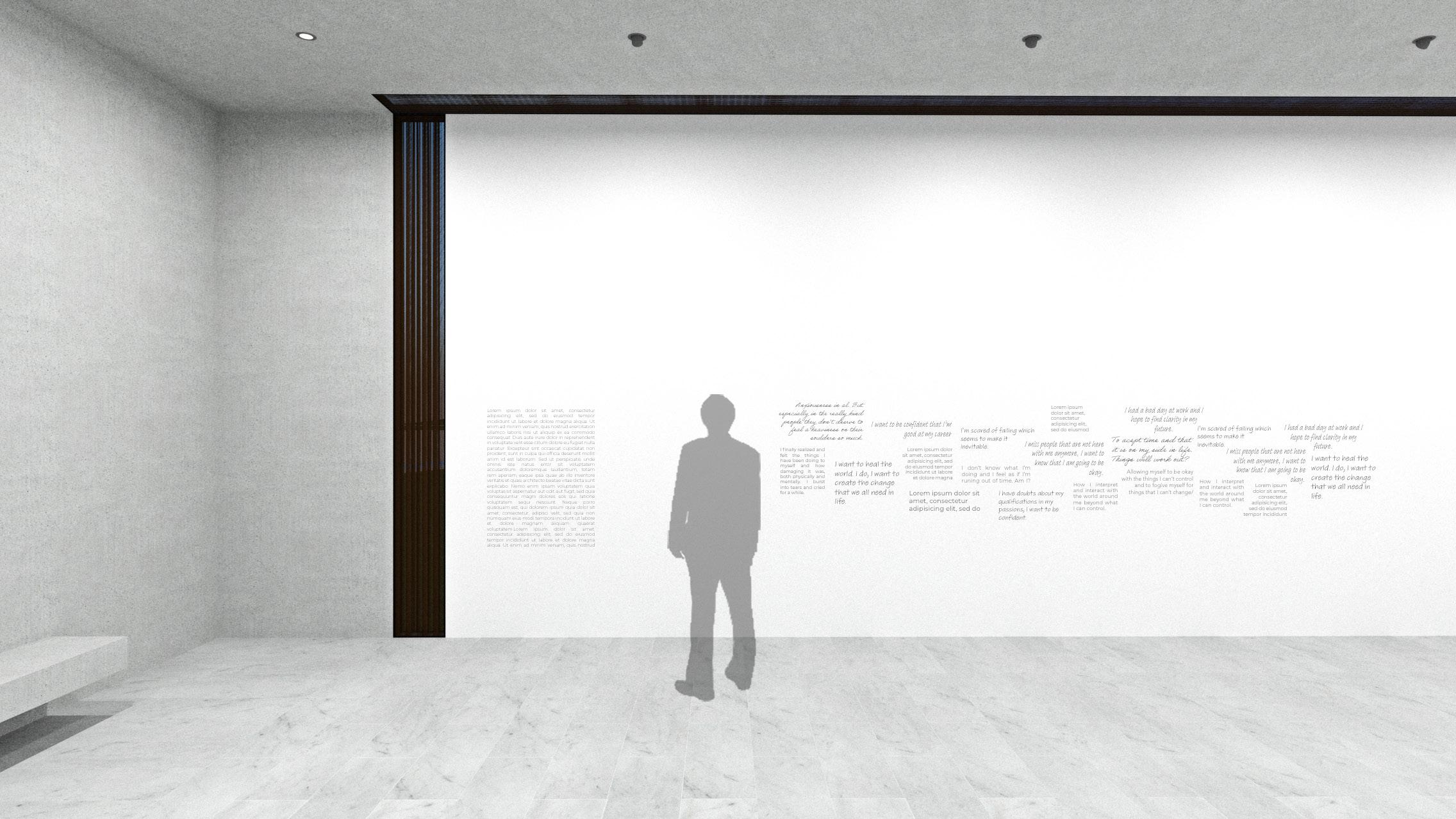 A blank canvas for the partaking in this healing experience of personal vulnerability through expression and thought. At first encounter the user in this space is greeted with a soothing floor to ceiling water wall feature surrounded by blank white walls such as this one pictured above. Blank, just before many people come to leave their mark. This space is not only designed for a self-curated experience, but it is also designed to be a collective experience by housing group meetings and events. There are chairs located in storage as well as restrooms in the back for all visitors. With the user always in mind the selection of materials was chosen through experimentation and research. To achieve the design concept through detailing the relationships between interior design, architecture, and materiality had to feel unified. It is that of a clean palette not to take over the experience that people will have here but to emulate that experience and truly provide for an enhanced quality of life.