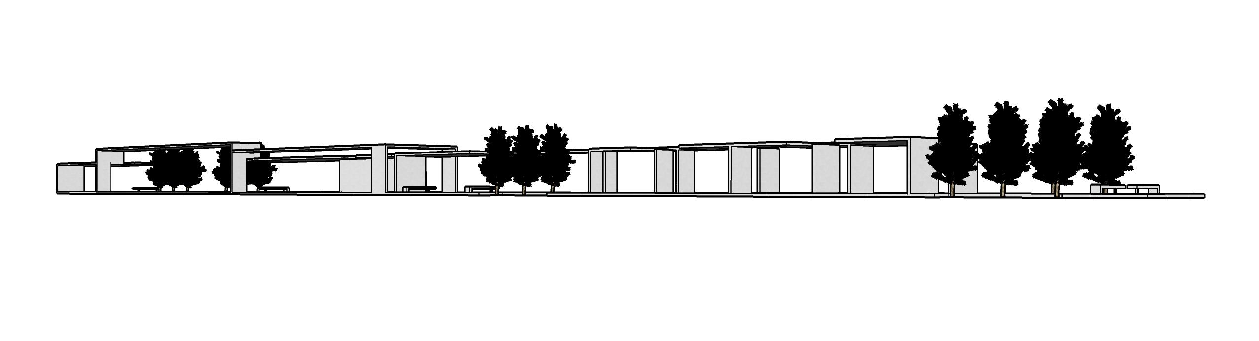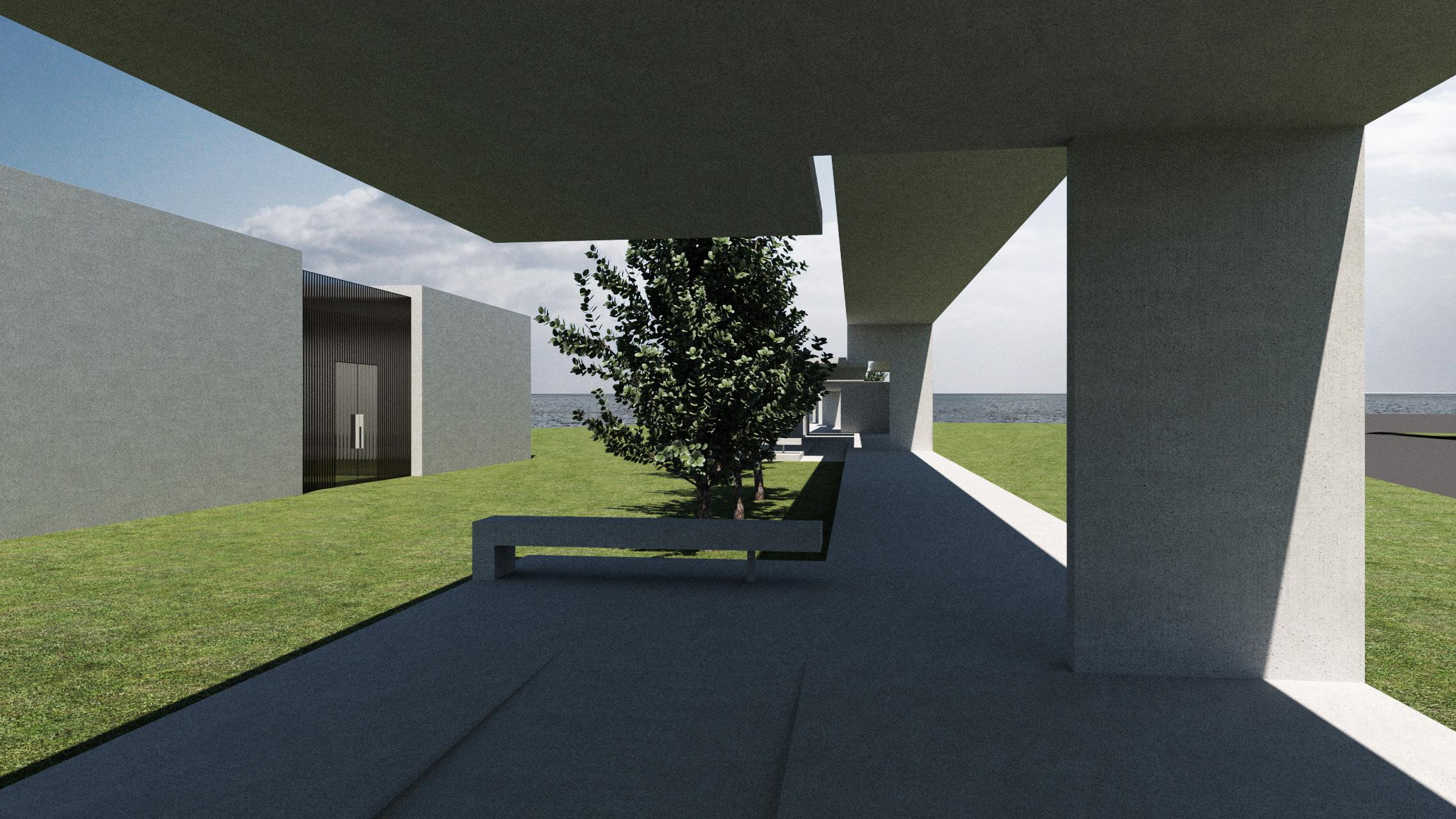 Standing here during the time of day the contrast is even more enhanced up close. The larger concrete slabs that create a closed in feeling were designed in the structure right about in the middle to resemble the feeling just before the sense of relief. With more to come in sight there are many ways of course that can be taken from here. On the opposite side of both walls are bench seats, further off are three tree gardens, and a series of perspective walls to interact with. Upon entering the structure from any point, the look and feel will be different through the duration of the experience. Viewing here from the West side at this time of day it has a lot of shade and minimal light only to capture a sliver as it beams down the side. The contrast and highlights from the sunlight are predominant, intriguing one to continue further. With the interior building in sight the intent is to show that they fit to exist together.