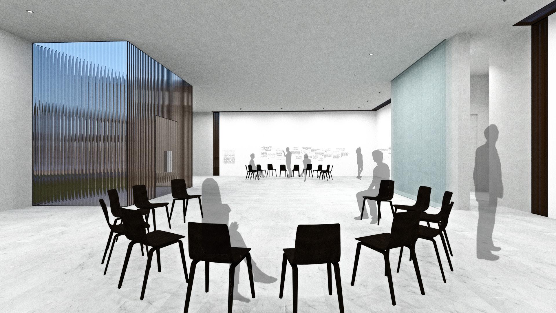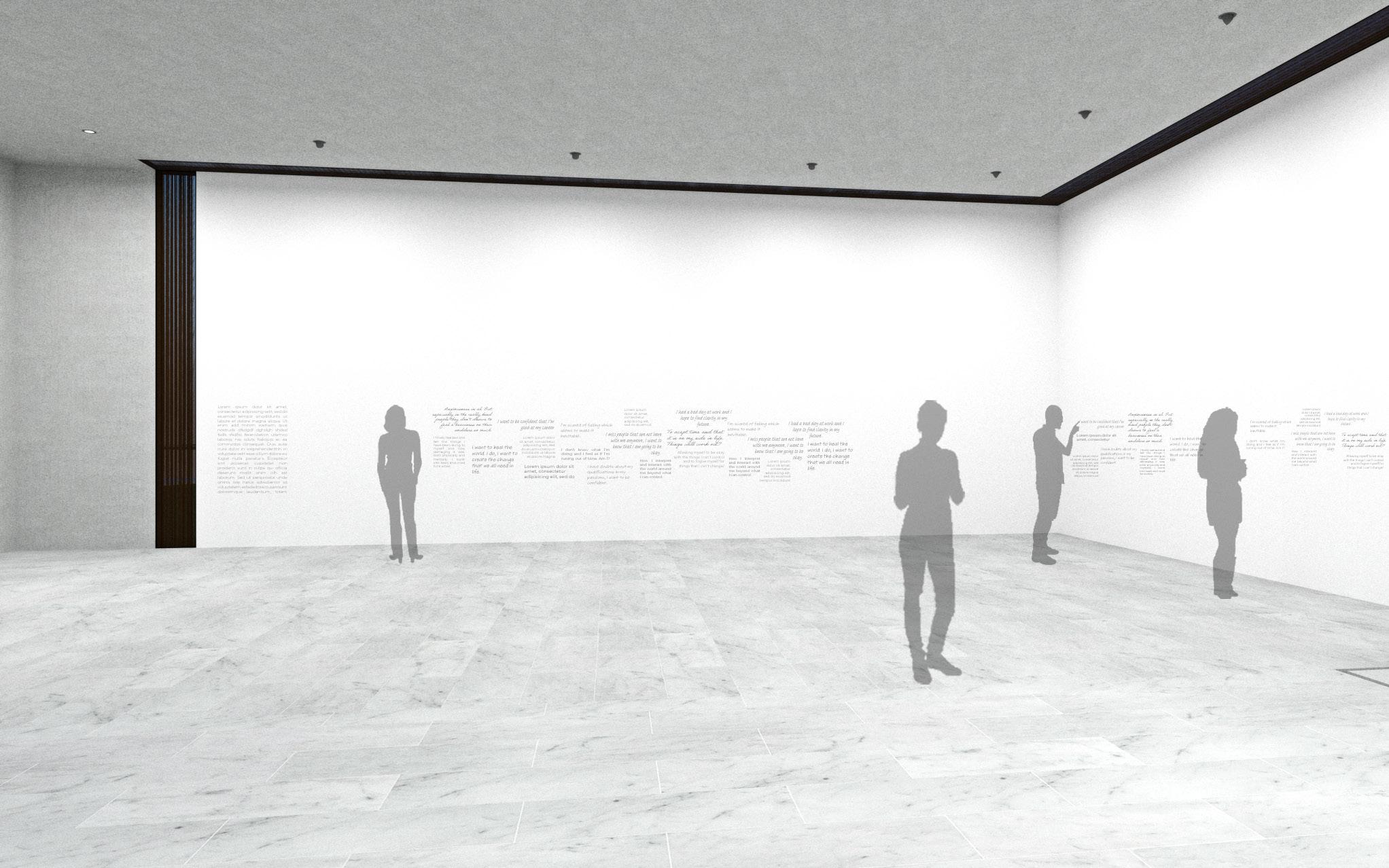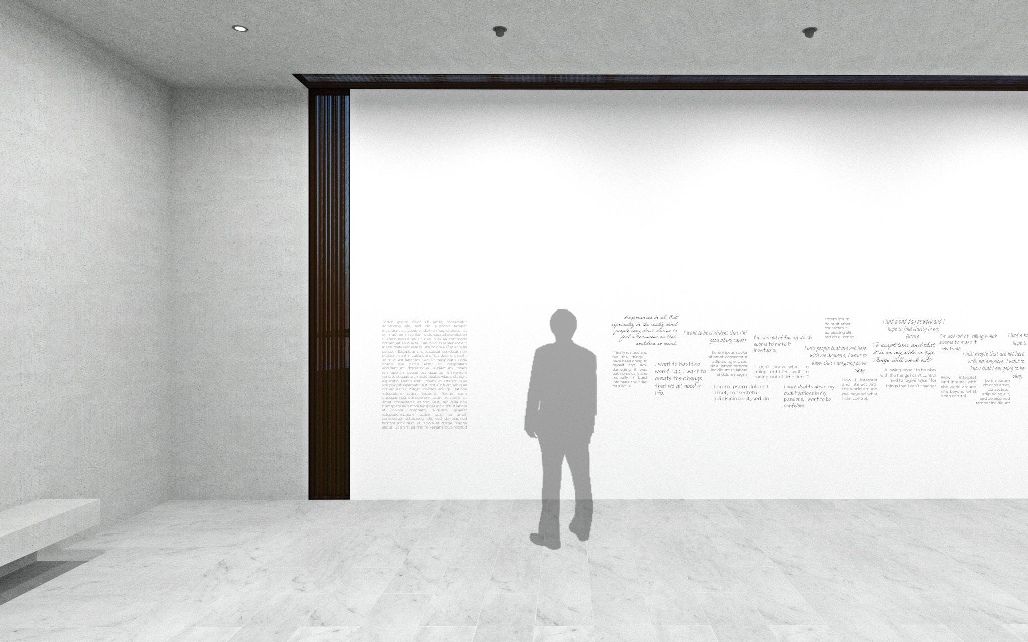 This experiential interior building has a total footprint of 3,638 SQ. FT. Developed with careful attention to detail creates a clear-minded experience upon entering by designing the details to be one with the whole. Through the corrugated glass vestibule there is a blank canvas of walls providing the optimal opportunity for collective and self-growth. A journey of healing starts by getting things out of the mind and into the world in some way, shape or form. Anonymously written; one can express their thoughts and begin their healing process. Here too, one can read passages that were previously written by others and whether we are present with one another or not this space carries a deep meaningful connection across all distances. Highlighting healing through expression in the design of this space ties it together with the architectural structure. Through experience and interaction in well-designed, purposeful spaces positive improvement can happen in ones thinking, cognitive abilities, mental and physical well-being, and emotions.
