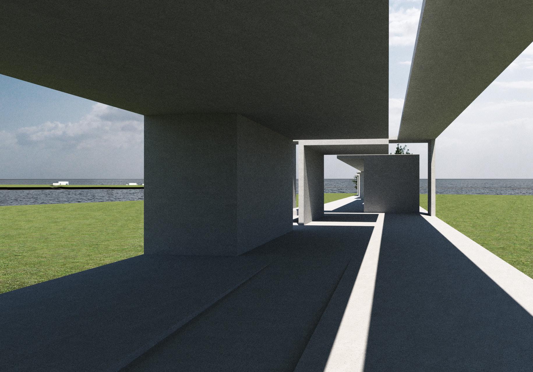 Moving forward in the structure there are differentiating heights that appear, meant to provoke a sense of curiosity for what is next to follow. At this point looking out one begins to get more of a sense of the site around the structure. As the height is raised up it feels much more open and airier. In the distance a ways there are multiple lines of light bouncing off the structure amongst the dark shadows. Light is a crucial element of health and healing.