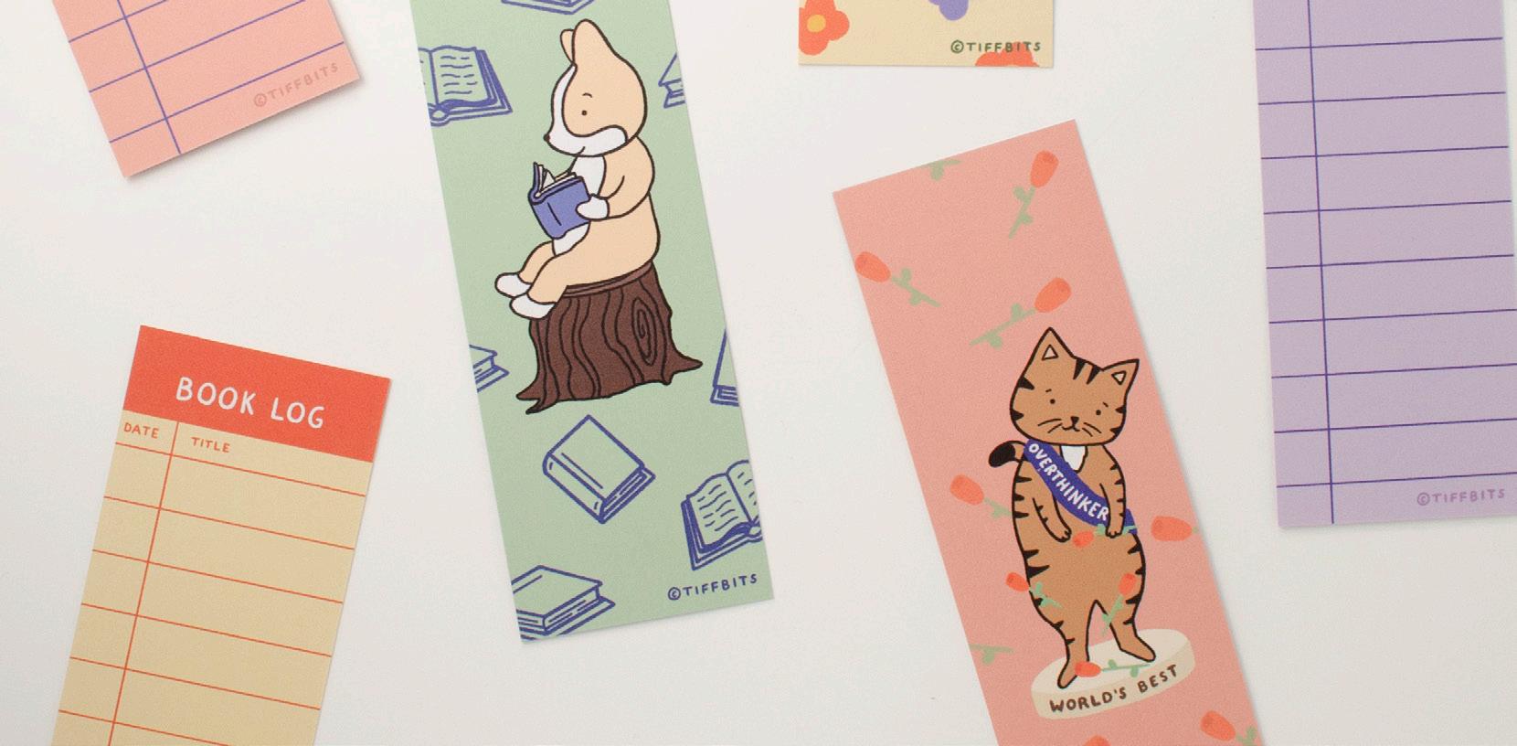 Design on one side and a colorful Book Log to fill out on the back! 2” x 6” size | Printed on matte cover stock | Made in USA Minimum of 6 per style | $1.75 ea NEW! BM-001 Corgi Reading NEW! BM-002 Go At Your Own Pace NEW! BM-003 Supposed to Be NEW! BM-004 World’s Best Overthinker