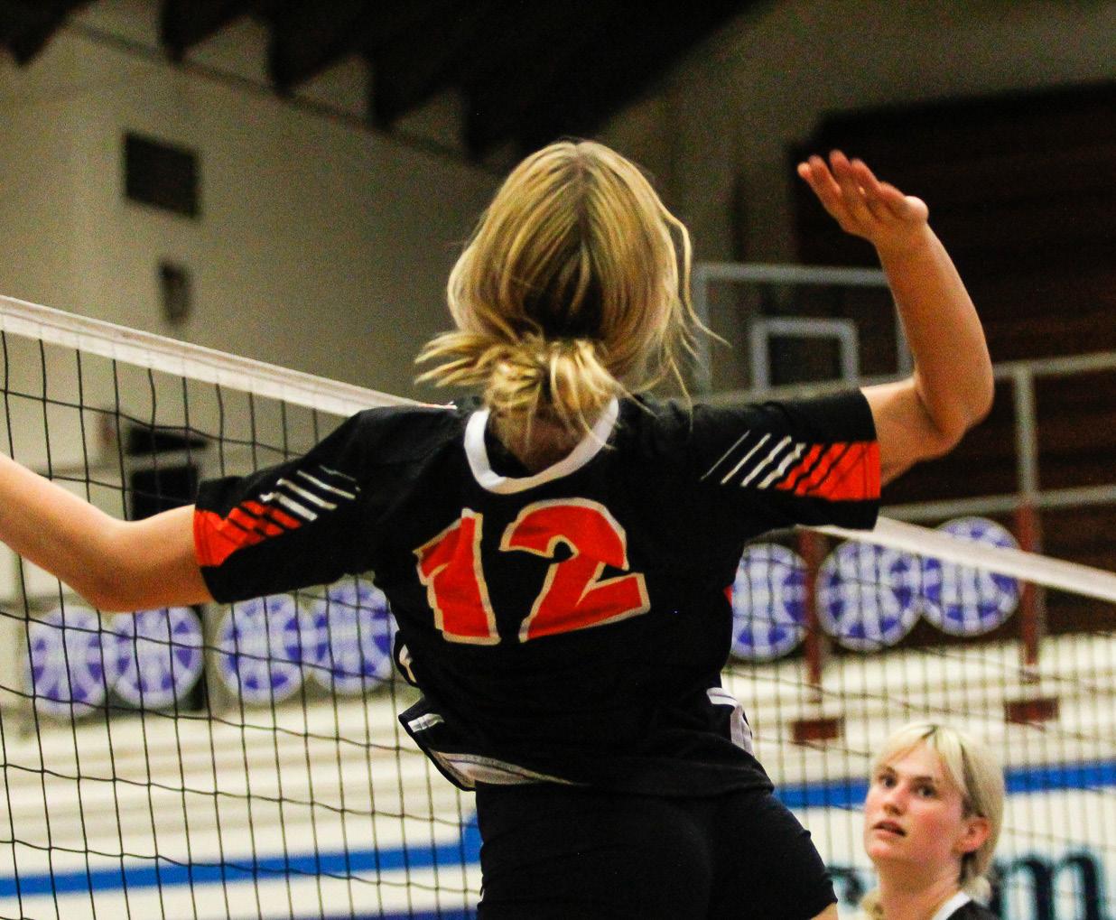 ATTACKING THE NET, freshman Senya Dorny winds up to spike the ball swiftly past her opponents.