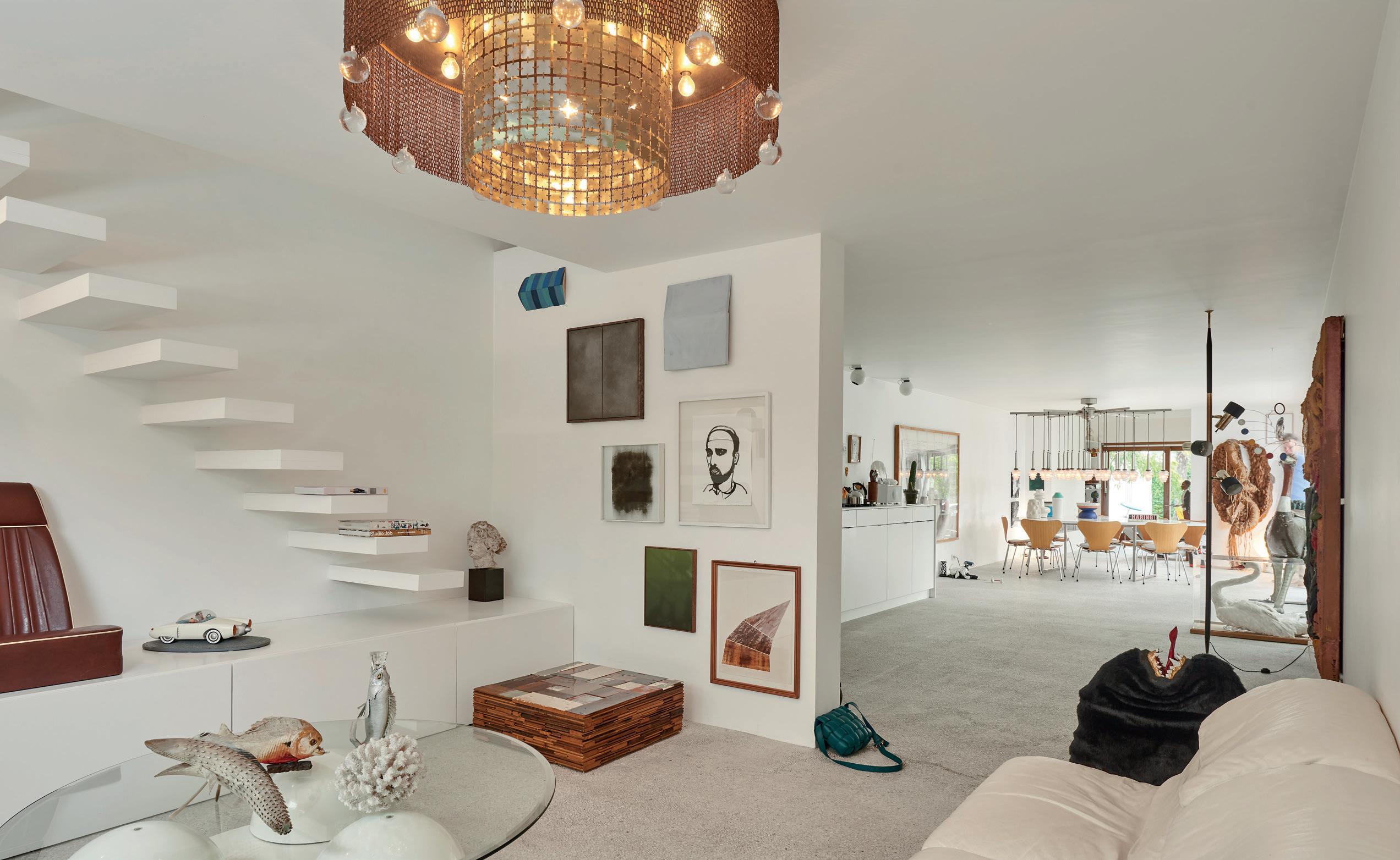 ‘Kijk’, zegt hij als we weer in de kantoorruimte komen. En hij toont ... niets. Beeldschermen en de airco werden weggewerkt, zelfs de geluidboxen zitten verstopt in een bepleisterde muur. ‘Weer een oppervlakte waaraan je een kunstwerk kan hangen.’ Collega Zoë Verrees vult aan. ‘Hoe minder schakelaars, stopcontacten en plinten je ziet, hoe beter.’