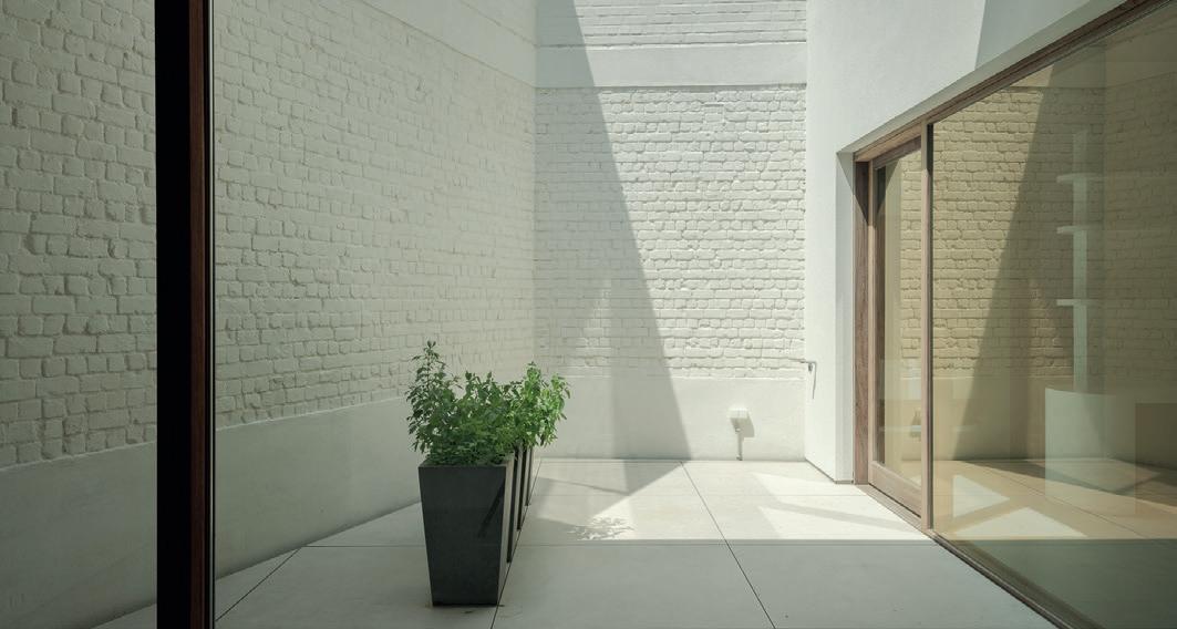 op met uitzicht op het KMSKA. Het ontwerp speelt sterk in op die context, met een grote douchekamer vanwaar je pal op het museum kijkt. ‘Zowel de voorgevel als delen van het interieur zijn beschermd’, vertelt Lenaerts. ‘De restricties die monumentenzorg oplegt verzoenen met bijvoorbeeld energienormen is niet evident, maar we hebben er het maximale uitgehaald. Voor de inrichting respecteren we de authenticiteit, maar we wijken wel wat af van het typische herenhuis.