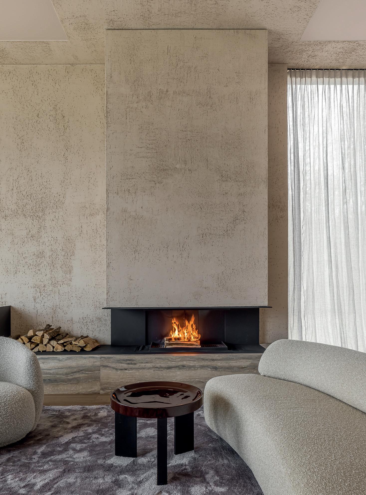 ‘Tweede punt waar ik aan vasthou, is dat de haard geplaatst moet worden op de ooghoogte van iemand die in een fauteuil zit. Daarom bouwen we veel van onze haarden zeer laag tegen de grond. Dat is geen nieuw idee, dat deden de neanderthalers ook al. Zij stookten een vuurtje en hurkten errond. Wij doen dat iets comfortabeler, maar ik hou wel vast aan dat idee, ook dat brengt visuele rust.’