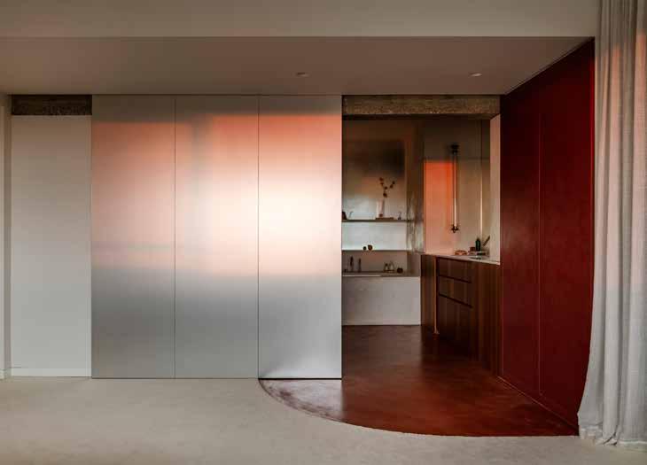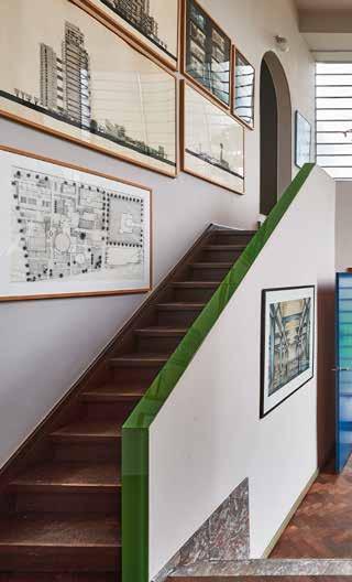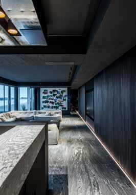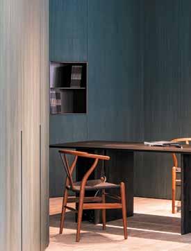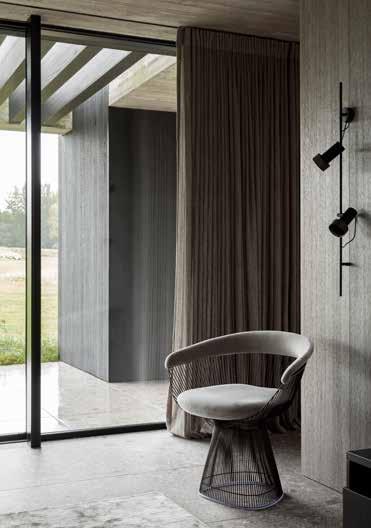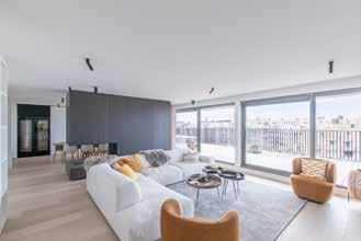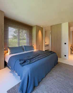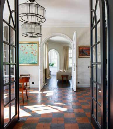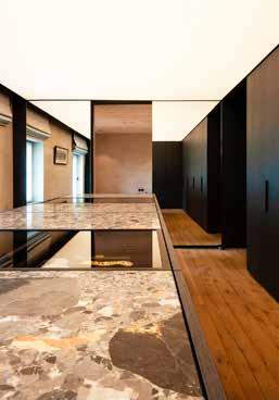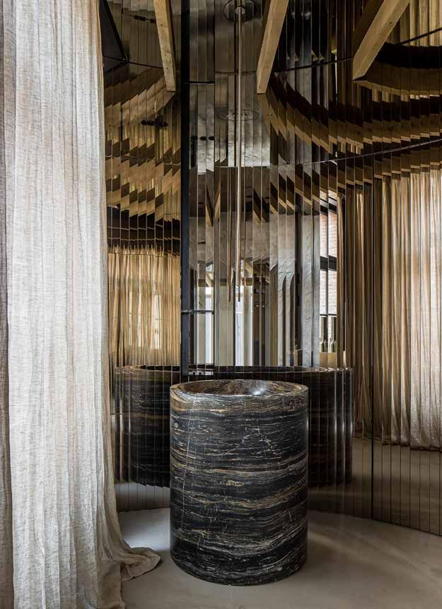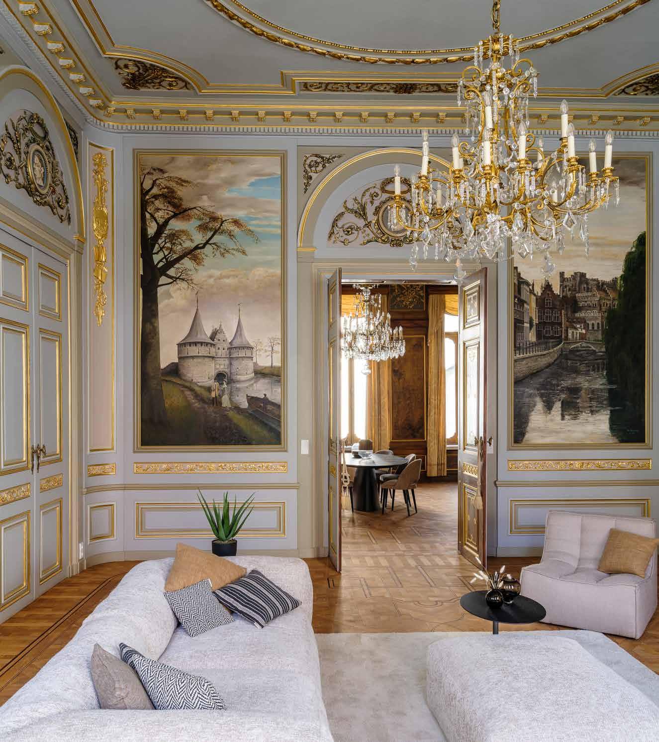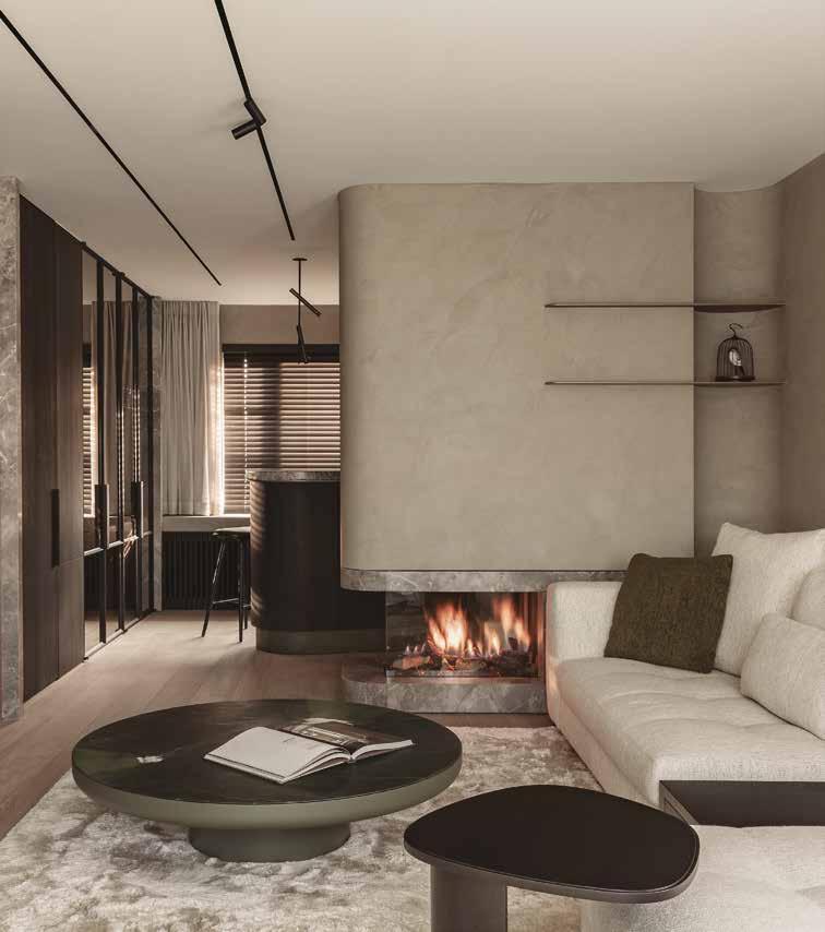 Binnenstappen in de woning van Dennis T’Jampens is een feest voor het oog. In de hal van twee verdiepingen slorpt de signature draaitrap alle aandacht op. Een opvallende glazen pivoterende deur leidt naar de woonruimte met een marmeren eettafel en Minotti-fauteuils in het zitgedeelte. Warmte komt letterlijk en figuurlijk van de haard, de tapijten en de gordijnen. Draaiende panelen vormen indien nodig een afscheiding met de keuken. ‘Ik hou van warm, tijdloos modern’, zegt T’Jampens, zijn leitmotiv.