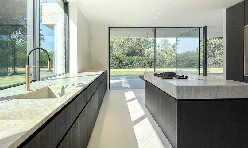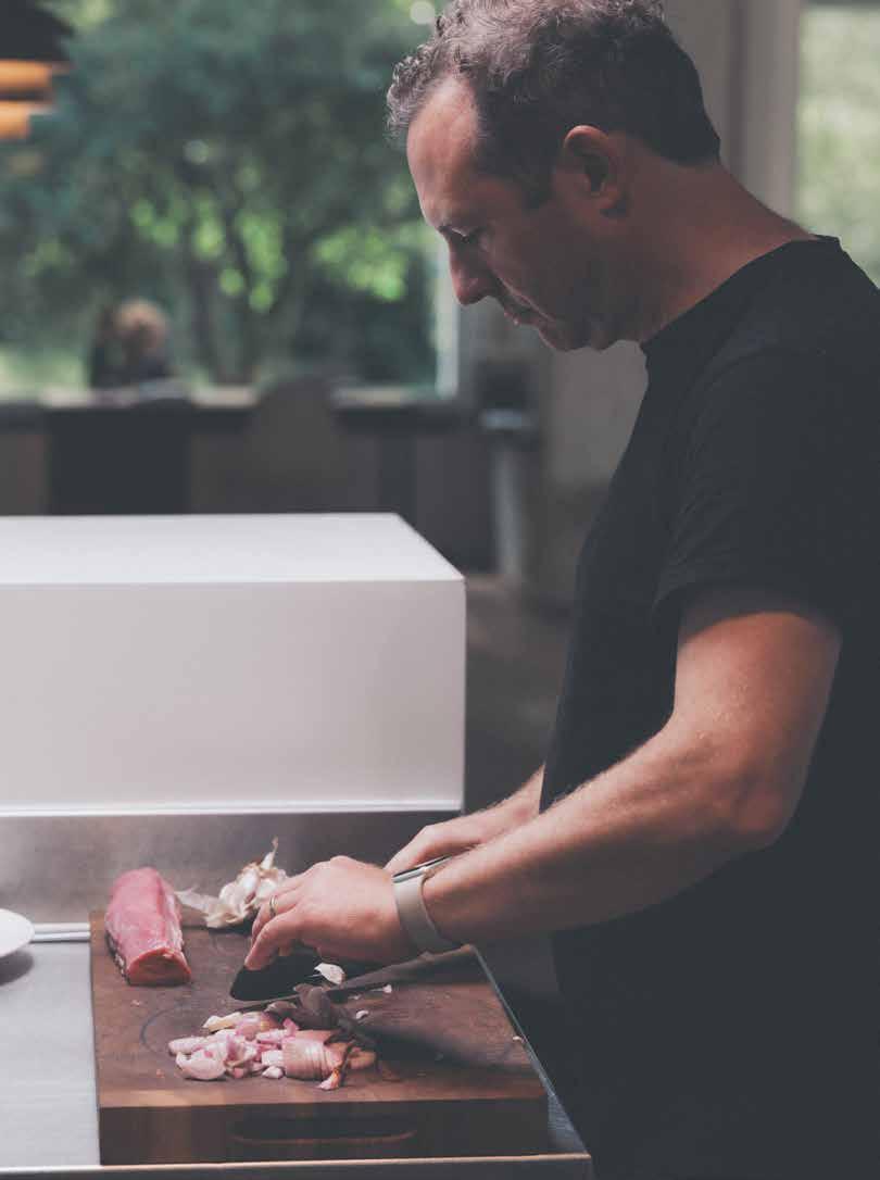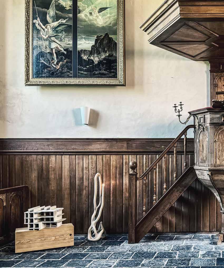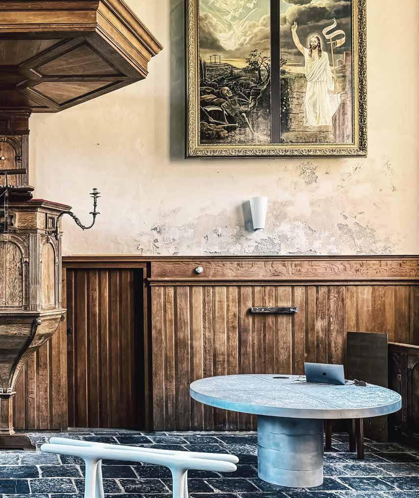 meteen verkocht. Ik zag veel meer dan een vervallen hoeve die al jaren leegstond. Oorspronkelijk was dit zelfs een klein klooster, de Vaucelles-abdij van de paters cisterciënzers. Het gebouw bevond zich in een abominabele toestand, de laatste bewoner, een boer, was jaren voordien overleden. Maar ik zag het potentieel van de grote volumes van het pand, en mijn kans om terug naar de natuur te trekken. Ik ging aan de slag om het geheel te renoveren. En dit is het resultaat. Zelf woon ik nu dus in het vroegere woonhuis, de koeienstal heb ik verbouwd tot toonzaal en de varkensstal is mijn keuken.’
