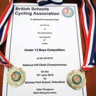 Cal recently won the overall National U13 Boys Cycling Championship and was awarded the British national jersey to wear in competition next year. a lthough at the time of writing, there was till one more individual championship to go, the national Grass t rack Champs in Leeds on 23rd July, Cal had already established sufficient margin on his fellow competitors in the other national championships (cyclo-cross, bronze, mountain bike, 4th place, circuit race, gold, and hill climb, silver) to be sure of overall champion status. What amazing news for not only Cal just as he finished his time at the school, but also for t he Hall which has been proud to be represented in all these national schools events. We send you huge congratulations Cal, knowing that you have shown great skill and dedication over the various disciplines.