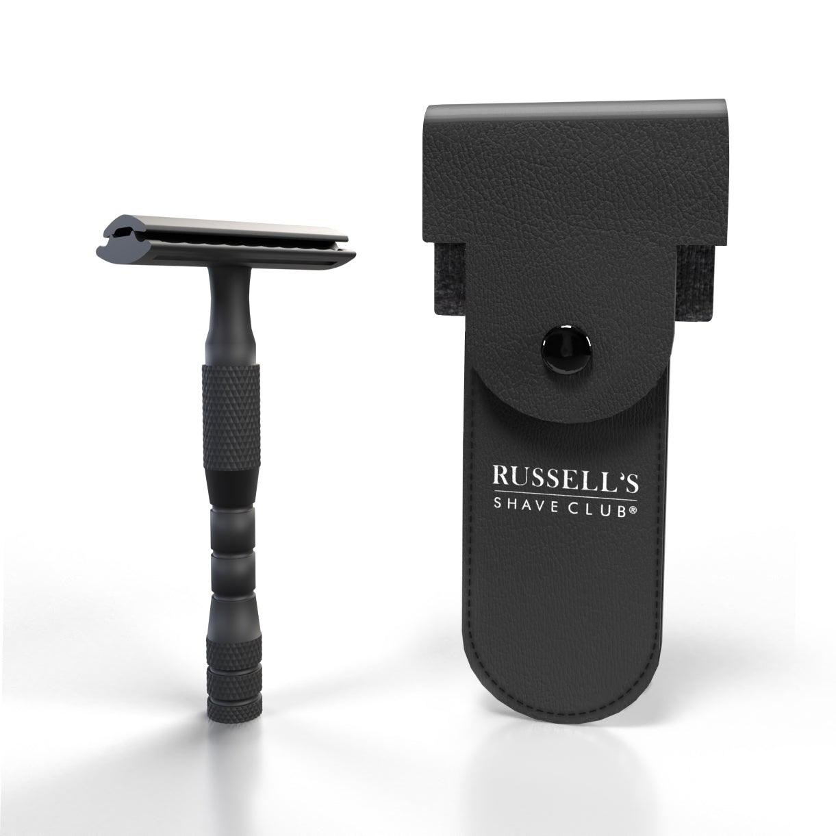 A premium quality double edge safety razor accompanied by an especially designed stand that showcases your place in Russell’s Shave Club.