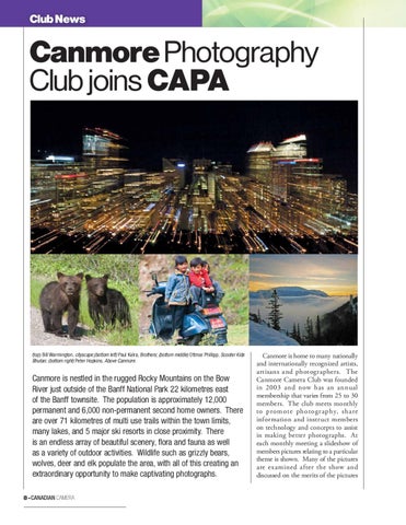 Canmore is nestled in the rugged Rocky Mountains on the Bow River just outside of the Banff National Park 22 kilometres east of the Banff townsite. The population is approximately 12,000 Âpermanent and 6,000 non-permanent second home owners. There are over 71 kilometres of multi use trails within the town limits, many lakes, and 5 major ski resorts in close proximity. There is an Âendless array of beautiful scenery, flora and fauna as well as a Âvariety of Âoutdoor Âactivities. Wildlife such as grizzly bears, wolves, deer and elk Âpopulate the area, with all of this creating an Âextraordinary Âopportunity to make captivating photographs. 8 - CANADIAN CAMERA