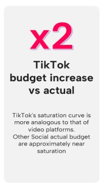 • TikTok acts as aVideoplatformin terms of budgetsaturation. TikTokMedia budget could even be doubled without encountering impacts on media performance