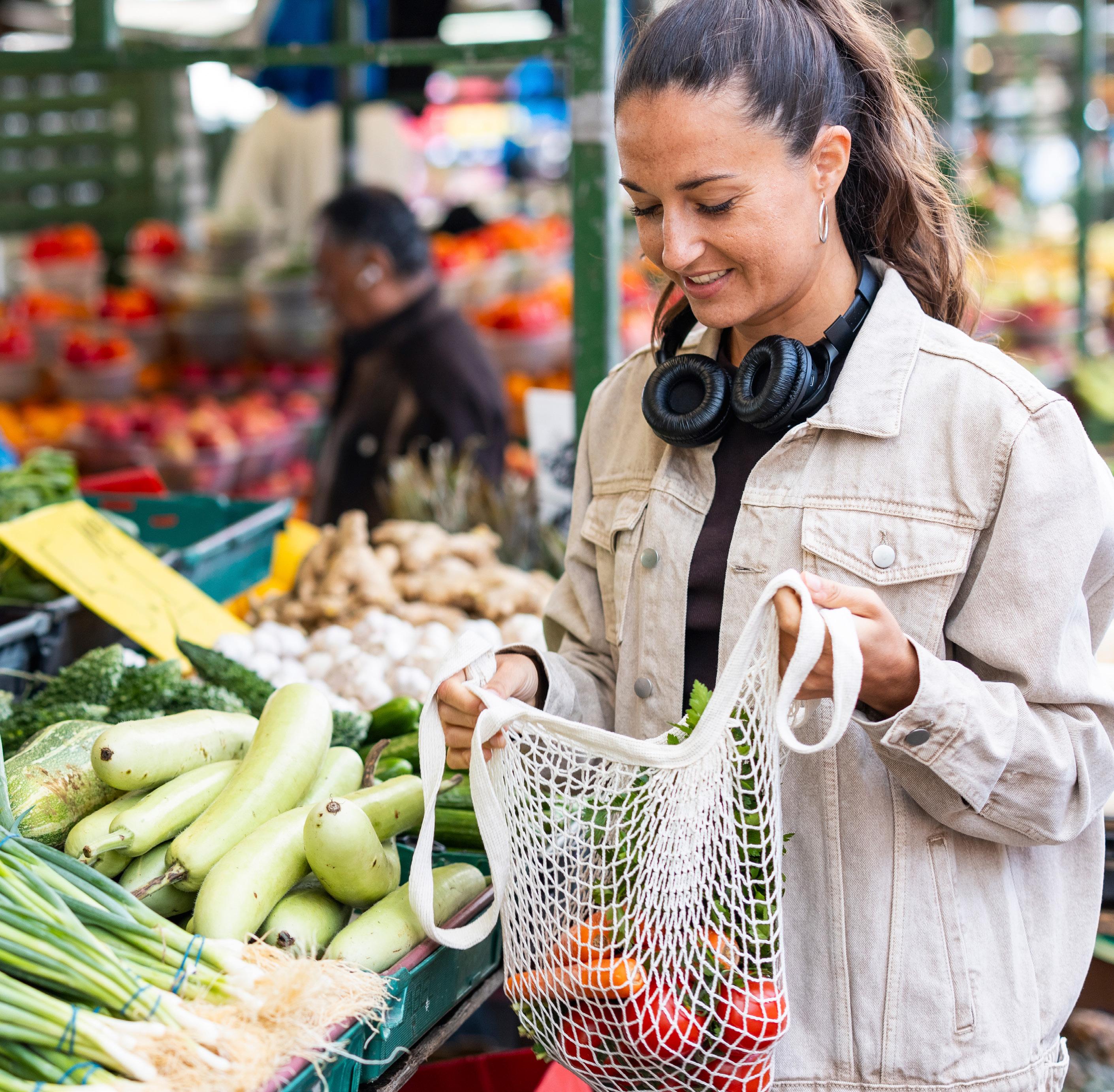 Show customers carrying retailer branded shopping baskets or bags. Include retailer branding.