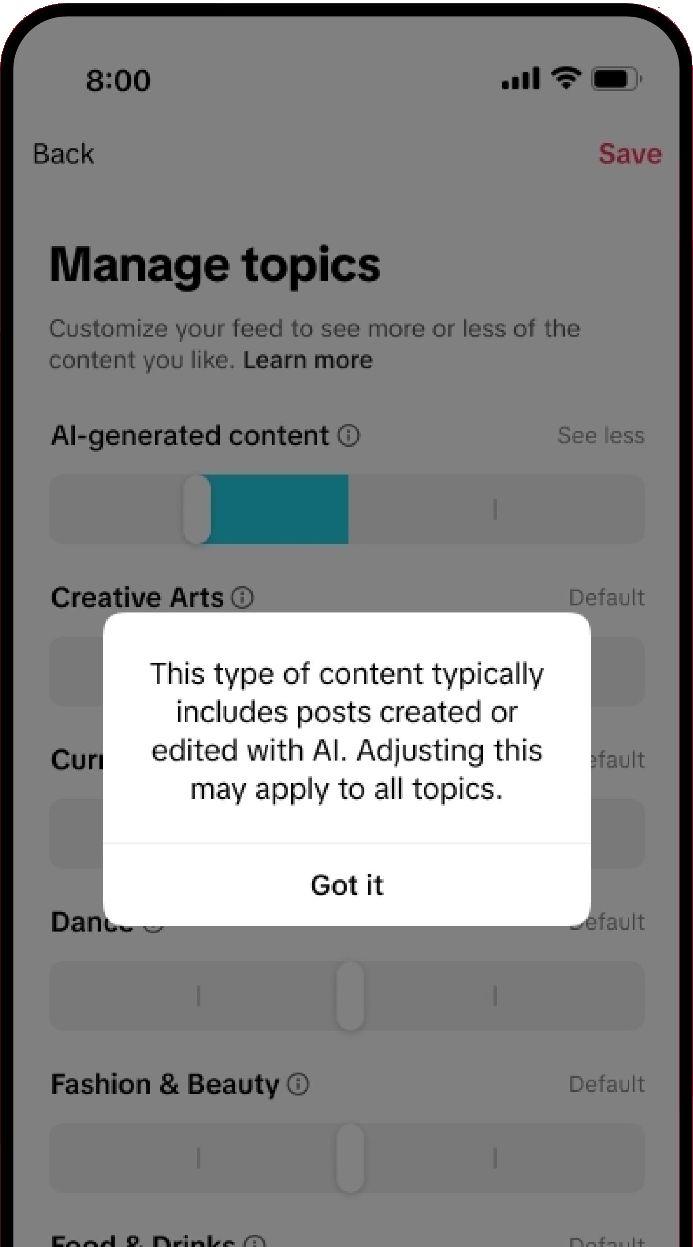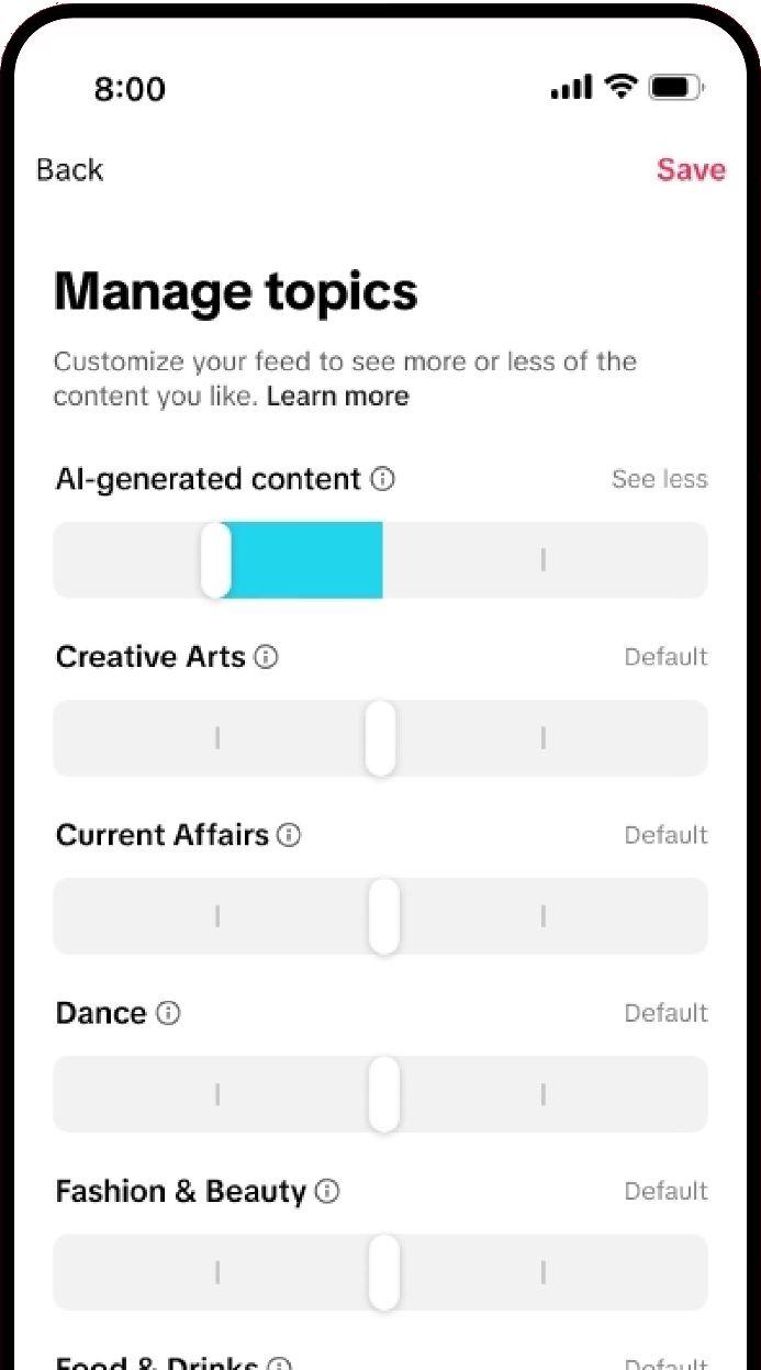 “AsAI-generatedcontentbecomesmore normalized,human-ledcreativitybecomesmore valuable.TransparencyaroundAIuseprotects trust,preservesauthenticity,andsetsclear expectationsforaudiences.Whenpeopleknow whatʼsreal,creatorsstandoutmore,brandsbuild strongerrelationships,andtheexperienceremains truetowhatmakesTikTokacreator-ledplatform.ˮ