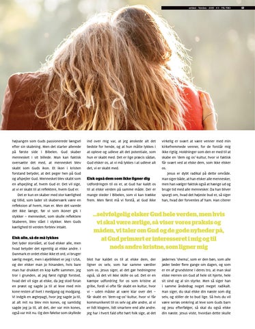 højsangen som Guds passionerede længsel efter sin skabning. Men det starter allerede på første side i Bibelen. Gud skaber mennesket i sit billede. Man kan faktisk oversætte det med, at mennesket blev skabt som Guds ikon. Et ikon i kristen forstand betyder, at det peger hen på Gud og afspejler Gud. Mennesket blev skabt som en afspejling af, hvem Gud er. Det vil sige, at vi er skabt til at reflektere, hvem Gud er. Det er kun en skaber med stor kærlighed og tillid, som lader sit skaberværk være en refleksion af hvem, Han er. Men det varede det ikke længe, før vi som ikoner gik i stykker – mennesket, som skulle reflektere Skaberen, blev slået i stykker. Men Guds kærlighed til verden forblev intakt. Elsk alle, så de må lykkes Det lyder storslået, at Gud elsker alle, men hvad betyder det egentlig at elske andre. I Danmark er ordet elske ikke et ord, vi bruger særlig meget, men i øjeblikket er jeg i USA, og der elsker man jo hinanden, hvis bare man har drukket en kop kaffe sammen. Jeg tror i grunden, at jeg først rigtigt forstod, hvad det vil sige at elske, da jeg stod foran en præst og sagde ja til at leve med min kone resten af livet i medgang og modgang. Vi indgik en ægtepagt, hvor jeg sagde ja til, at alt mit nu blev min kones, og samtidig sagde jeg ja til, alt det, der var min kones, også var mit nu. Og den følelse som skyllede