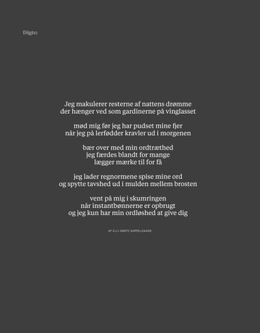 Jeg makulerer resterne af nattens drømme der hænger ved som gardinerne på vinglasset mød mig før jeg har pudset mine fjer når jeg på lerfødder kravler ud i morgenen bær over med min ordtræthed jeg færdes blandt for mange lægger mærke til for få jeg lader regnormene spise mine ord og spytte tavshed ud i mulden mellem brosten vent på mig i skumringen når instantbønnerne er opbrugt og jeg kun har min ordløshed at give dig Af Elli Gørtz Kappelgaard