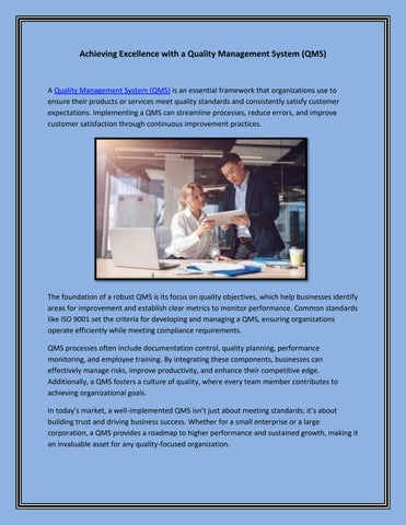 A Quality Management System (QMS) is an essential framework that organizations use to ensure their products or services meet quality standards and consistently satisfy customer expectations. Implementing a QMS can streamline processes, reduce errors, and improve customer satisfaction through continuous improvement practices.